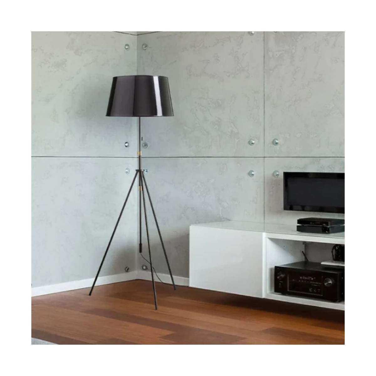 Il paralume in lamina nera lucida con interno dorato crea un contrasto raffinato e diffonde una luce calda e avvolgente, perfetta per valorizzare l’ambiente.
