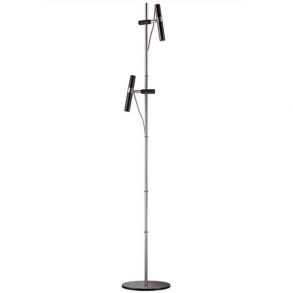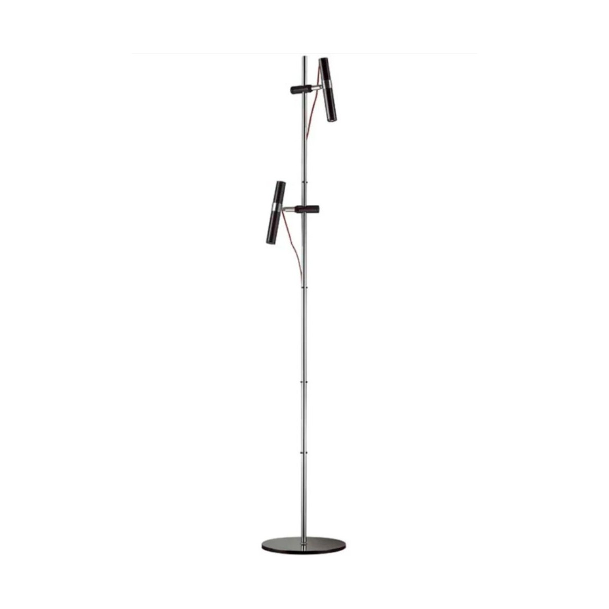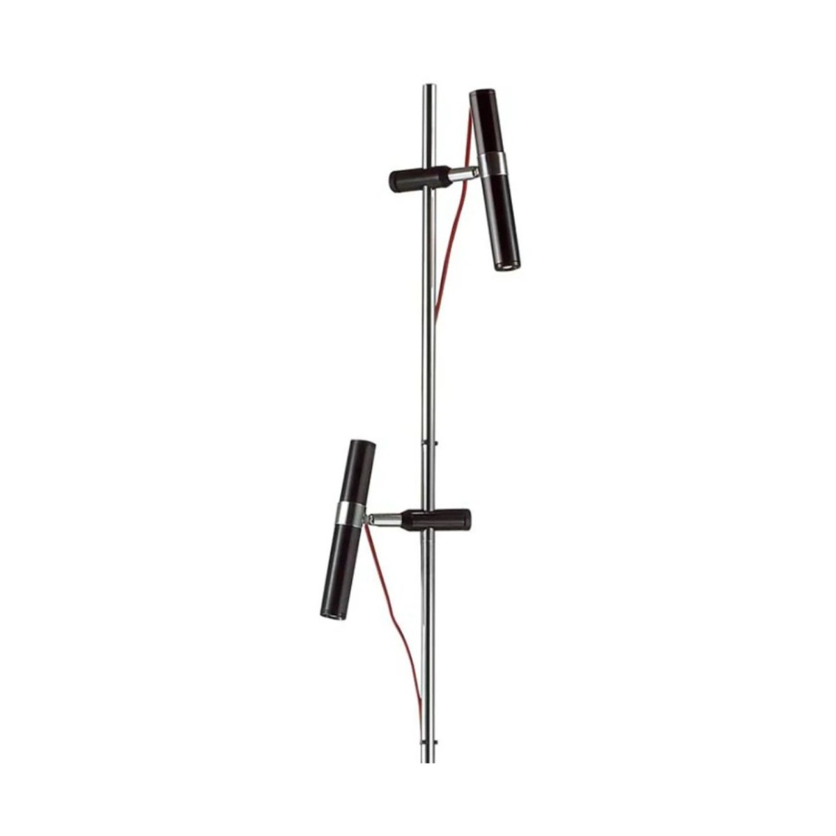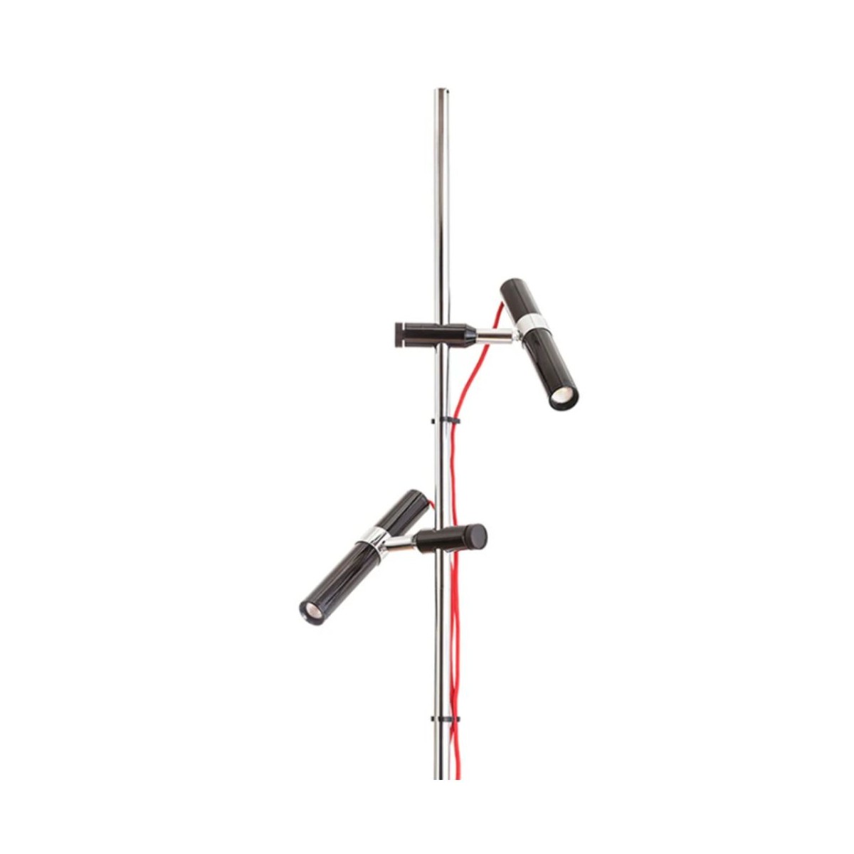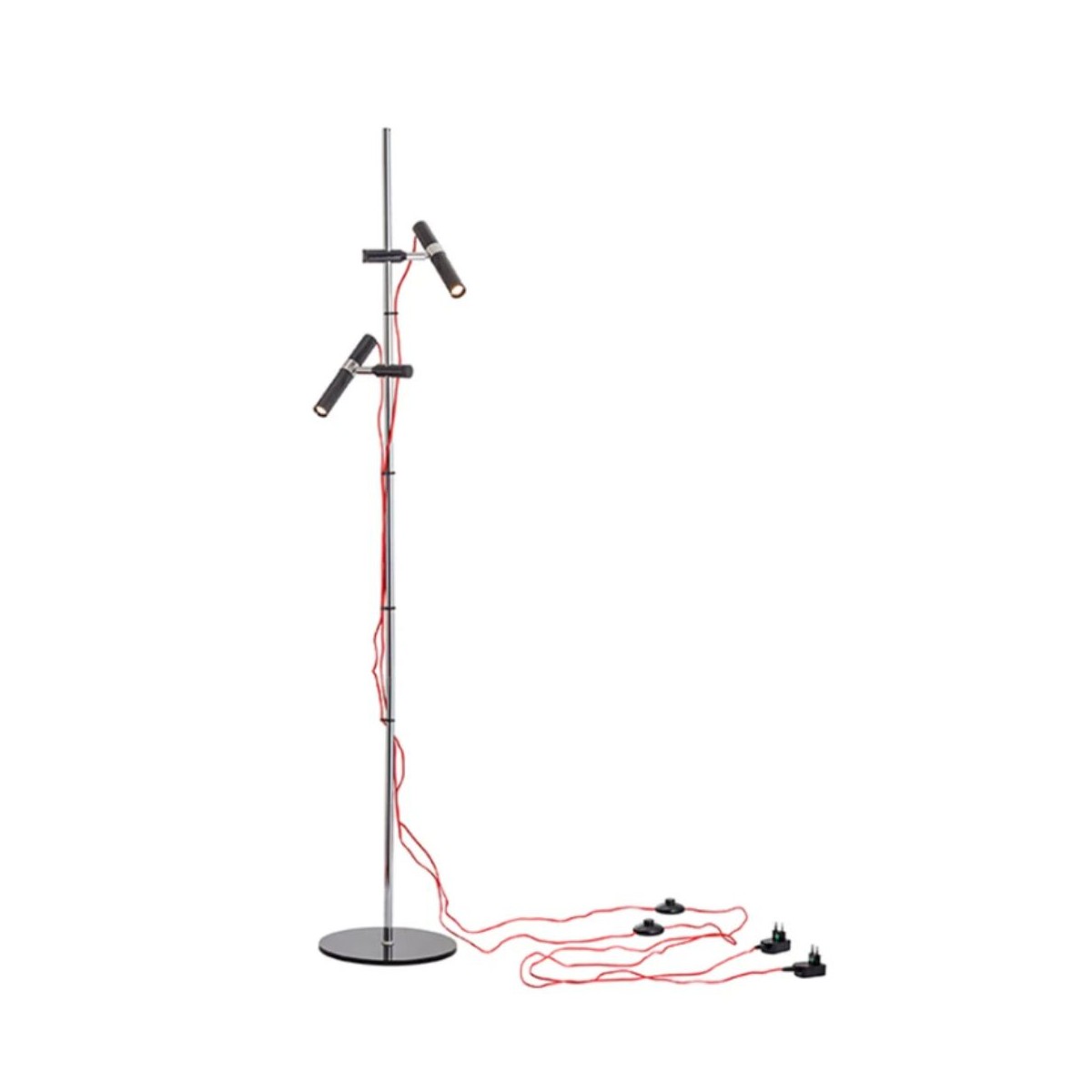 Lampada da terra VIPER cromata di design con due riflettori LED neri e scorrevoli, gestiti autonomamente da interruttori posizionati sui cavi di tessuto rosso.