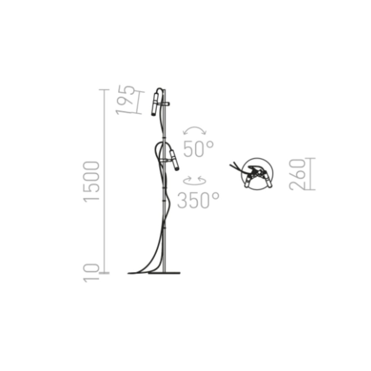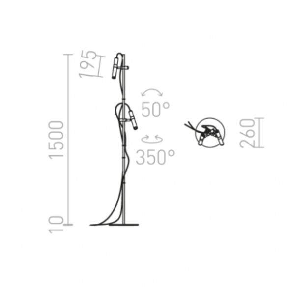 Le dimensioni – diametro 26 cm, altezza 151 cm – e gli angoli di inclinazione (50°), rotazione (350°) e luce (60°) garantiscono massima versatilità, rendendo VIPER una lampada elegante, pratica e dal forte carattere estetico.