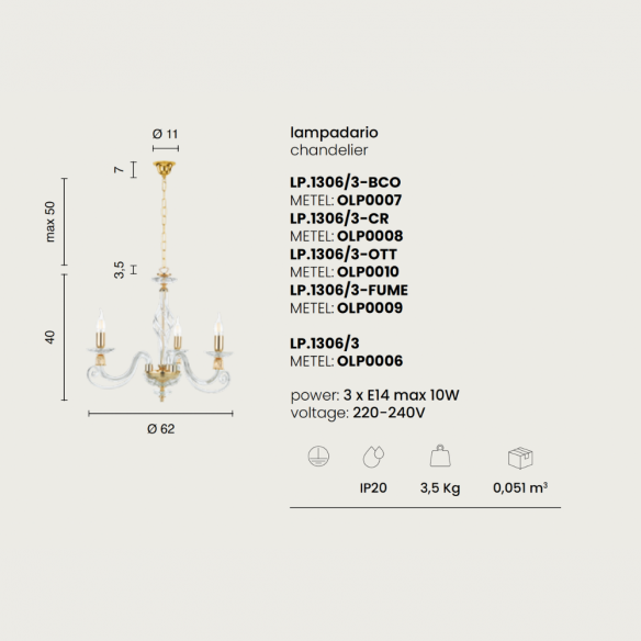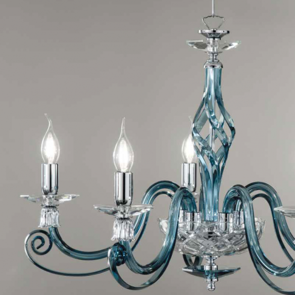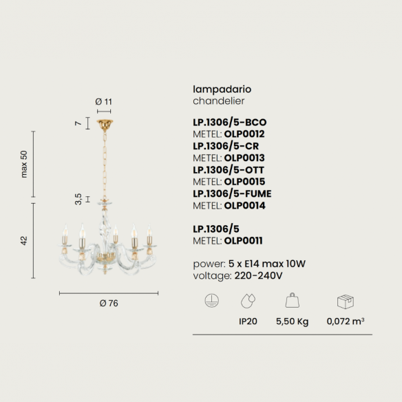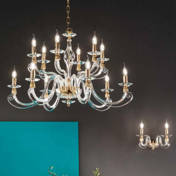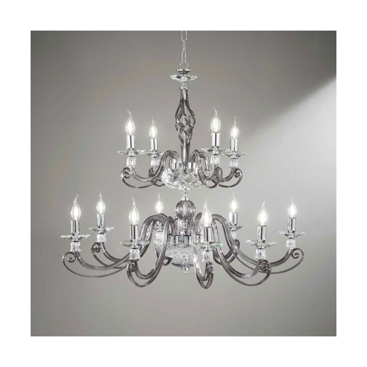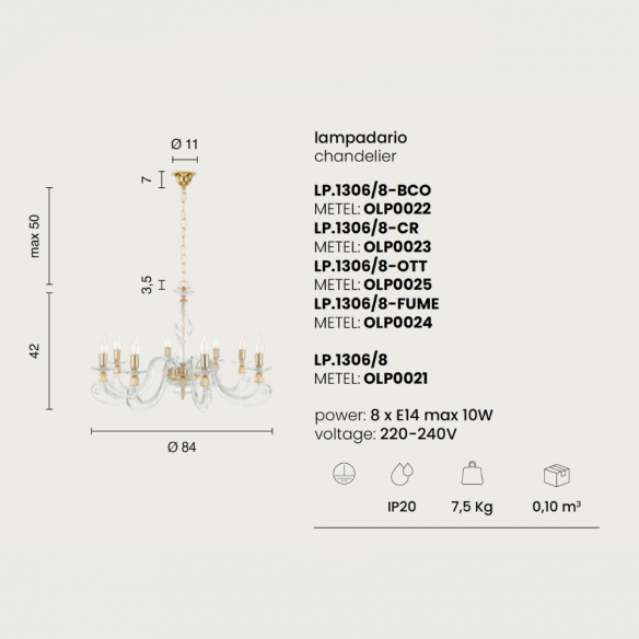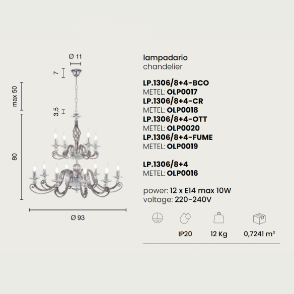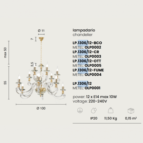 Disponibile in composizioni da 3, 5, 8, 8+4 o 12 luci, il modello 1306 si adatta con naturalezza a soggiorni scenografici, sale da pranzo formali o ingressi dove l’impatto visivo diventa protagonista. L’attacco E14 garantisce la compatibilità con una vasta gamma di lampadine, lasciandoti libertà nella gestione della luce, mentre l’assenza di sorgenti incluse consente una personalizzazione completa anche nella resa luminosa.