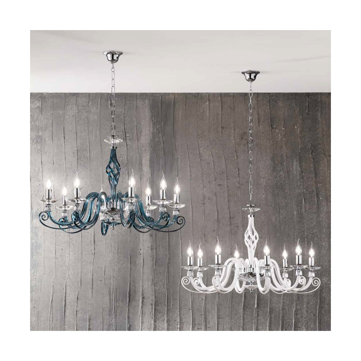 La vera forza di questa collezione risiede nella possibilità di scelta. Non solo nelle dimensioni – da 3 fino a 12 luci – ma anche nella combinazione di montatura e cristalli, che spaziano dal bianco puro al trasparente, dall’ottanio profondo al fumé sofisticato. Ogni versione restituisce una diversa interpretazione dello stesso oggetto, permettendoti di scegliere il carattere che meglio si integra con il tuo ambiente.