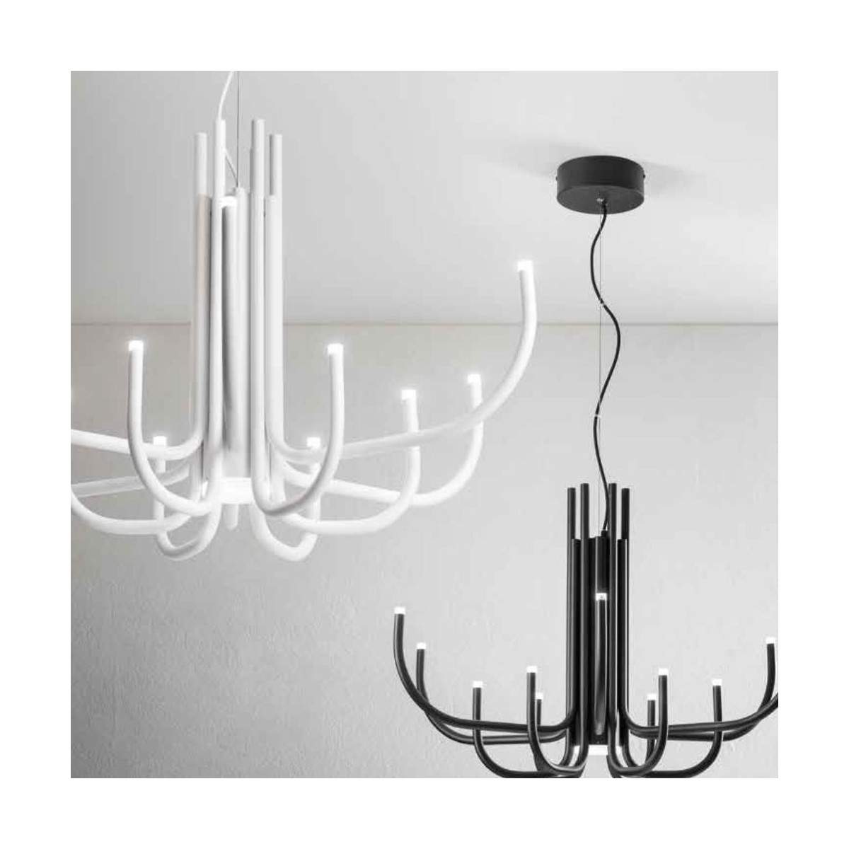 Disponibile nelle finiture bianco, oro e nero, con cavetti regolabili per personalizzare altezza e impatto visivo.