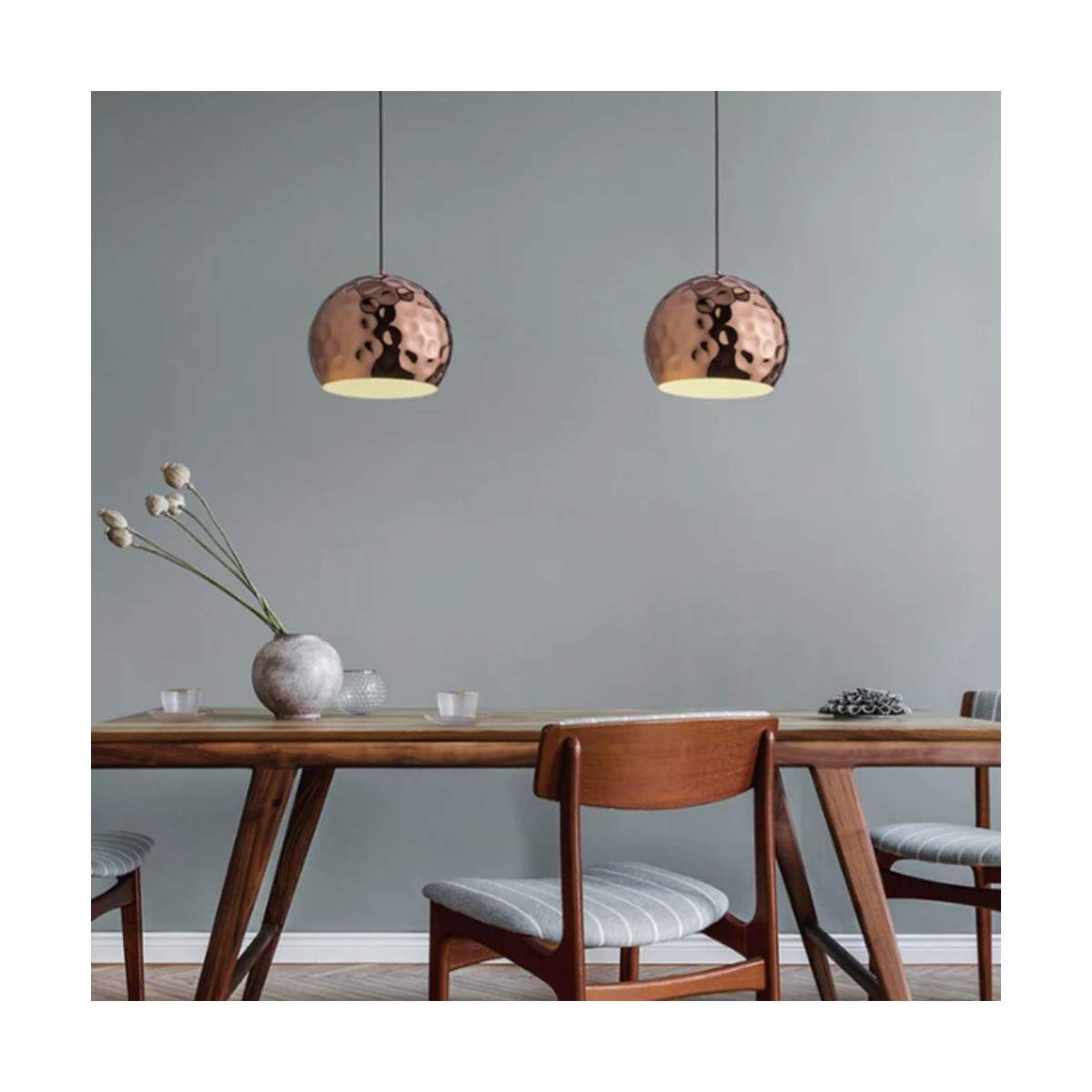 Grazie alle sue dimensioni compatte, illumina con stile cucine, tavoli da pranzo, angoli lettura e penisole, ma dà il meglio anche in composizione multipla per creare effetti scenografici e continui richiami metallici. Il cavo in PVC nero e il copribase in tinta rame completano il design con coerenza e cura del dettaglio. Compatibile con lampadine LED E27 e dimmerabile se abbinata alla lampadina giusta, ti permette di modulare la luce e l’atmosfera secondo il momento.
