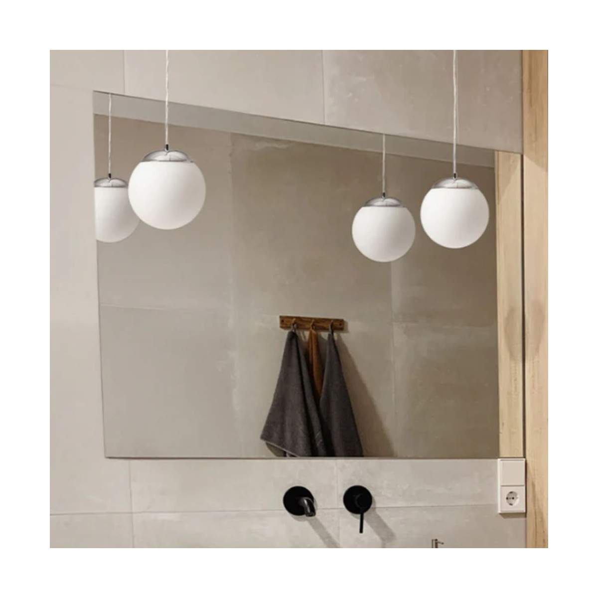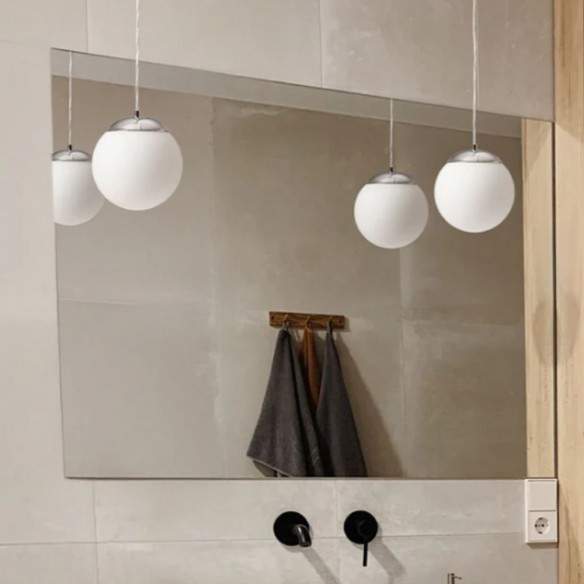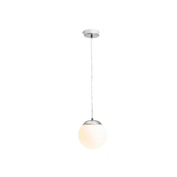 Lampada sospesa BOLLY in vetro opalino e accessori cromati. Adatto per ambienti umidi.