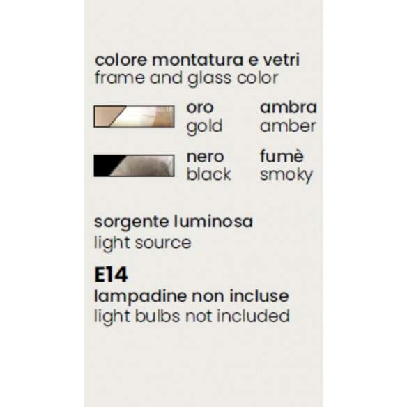 Proposta in due raffinate combinazioni cromatiche – oro con vetri ambra oppure nero con vetri fumè – Eliseo si integra perfettamente in ambienti dal gusto moderno, ma si adatta anche a contesti più classici in cerca di un tocco contemporaneo.
