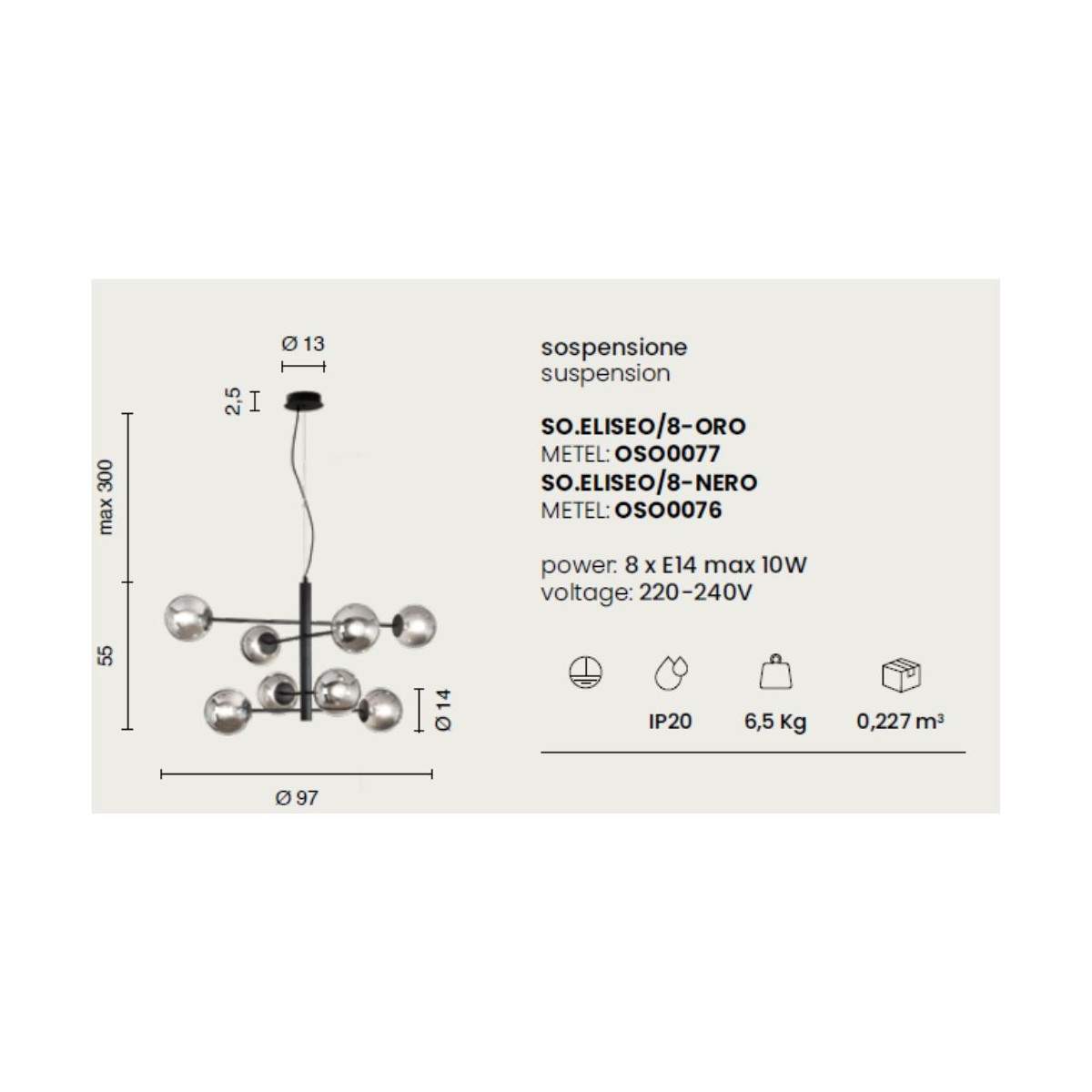 Compatibile con lampadine E14 (non incluse) e alimentata a 220-240V, Eliseo rappresenta la scelta ideale per chi cerca una sospensione elegante, funzionale e capace di trasformare la luce in atmosfera