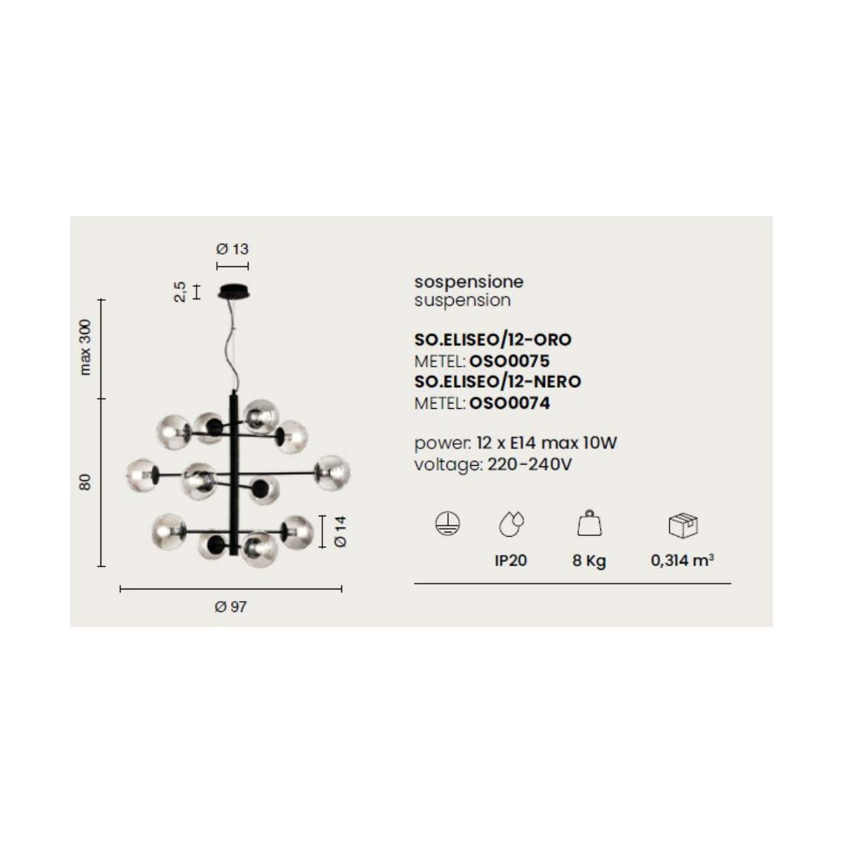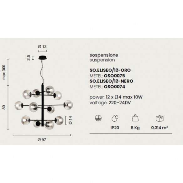 Compatibile con lampadine E14 (non incluse) e alimentata a 220-240V, Eliseo rappresenta la scelta ideale per chi cerca una sospensione elegante, funzionale e capace di trasformare la luce in atmosfera