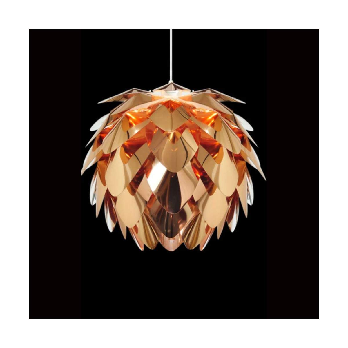 Disponibile in tre eleganti varianti: PVC bianco, pellicola cromata o lamina di rame, si adatta perfettamente a soggiorni, sale da pranzo o zone living che cercano un punto luce originale e distintivo. Compatibile con lampadine LED E27 15W, è regolabile in intensità se abbinata a lampadine dimmerabili.