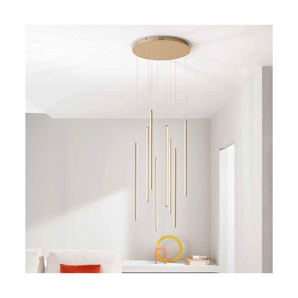 La versione piccola, solo nel nome, perché diventa subito protagonista dello spazio: con un’altezza di 62 cm e un rosone ampio da 48 cm, è perfetta per illuminare tavoli importanti o scenografici vuoti centrali, grazie alla potenza di ben 84W e una luminosità di 3600 lumen. Il cavo, regolabile fino a 150 cm, consente di trovare sempre l’altezza giusta per l’effetto desiderato.