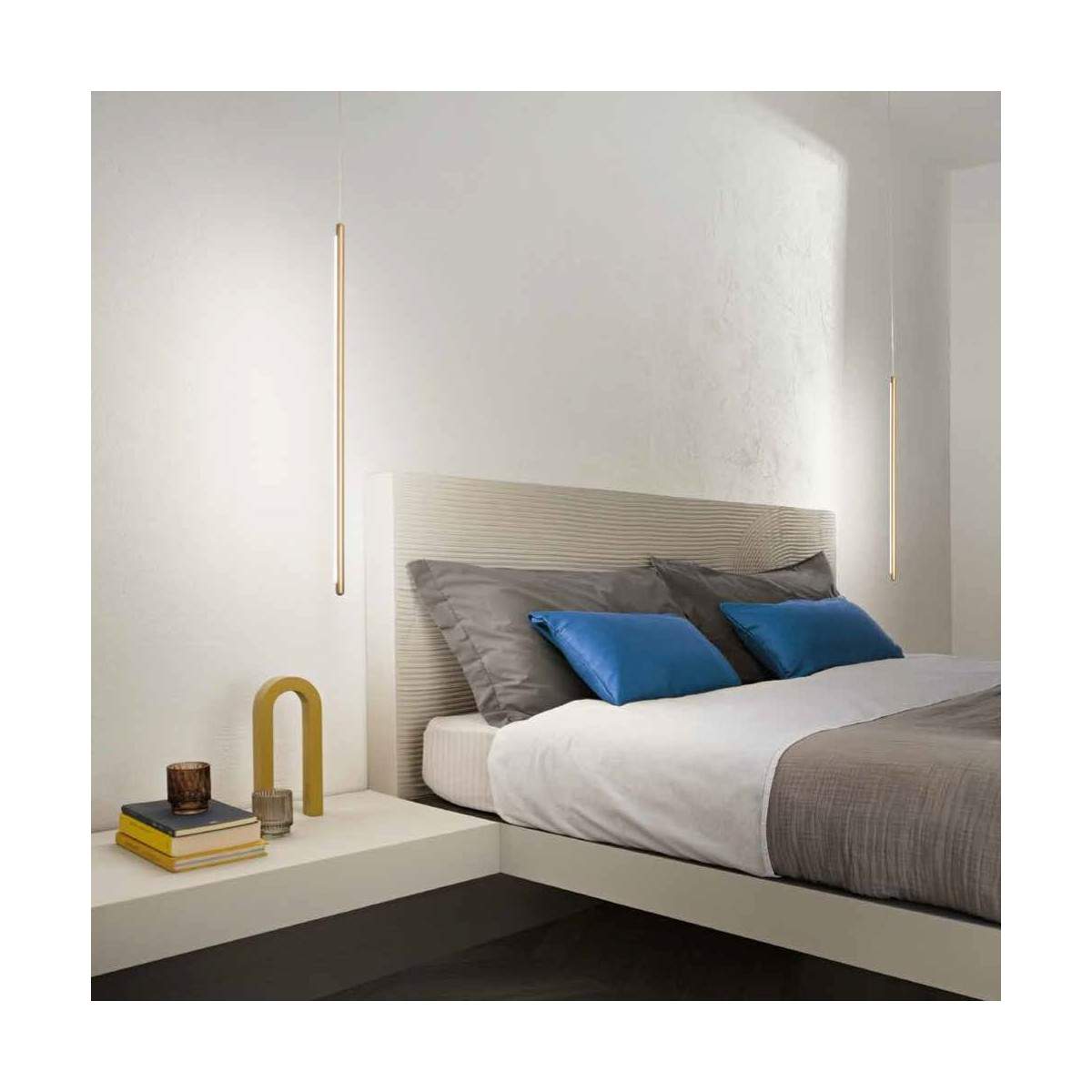 La versione grande, con un’altezza di 70 cm, un rosone minimale da 6 cm e un cavo regolabile fino a 80 cm, è pensata per illuminare punti precisi, come un tavolino o un angolo lettura. Ha una potenza di 12W, con 620 lumen, per una luce soffusa e rilassante.