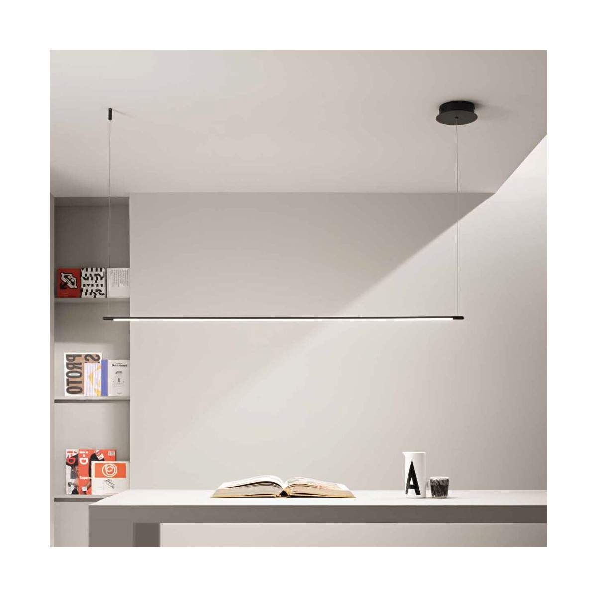 GENIUS1 è una lampada sospesa che porta la bellezza delle forme pure nel cuore della tua casa. Realizzata in metallo verniciato, questa lampada si distingue per un design minimal che lascia spazio alla vera protagonista: la luce.