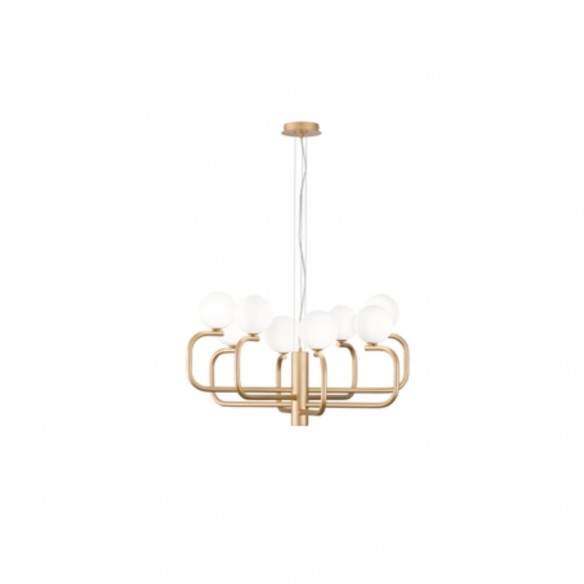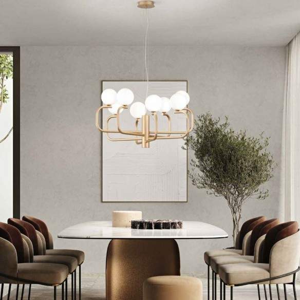 Jeppy è una sospensione dal carattere scenografico e al tempo stesso armonioso, pensata per trasformare ogni ambiente in un punto d’incontro tra forma e leggerezza. La struttura in metallo verniciato, disponibile in due eleganti finiture, sostiene una danza di otto sfere in vetro soffiato bianco satinato, che diffondono una luce morbida, uniforme e avvolgente.