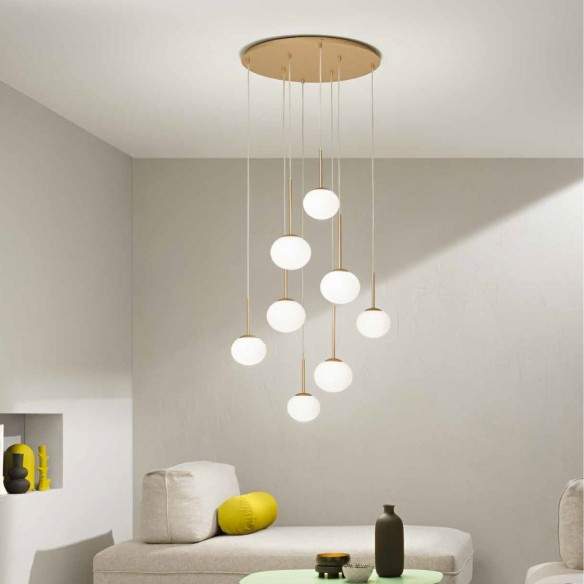 - Il modello a 6 luci tondo (diametro 55 cm, altezza 42 cm) diventa protagonista sopra un tavolo rotondo o in un living elegante.
