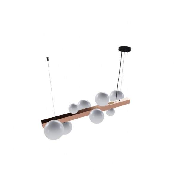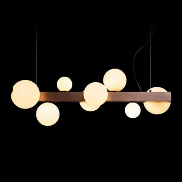 I paralumi si sviluppano su una struttura geometrica in metallo con finitura bronzo spazzolato, che conferisce calore e un tocco di eleganza vintage alla composizione. Ogni dettaglio è pensato per catturare lo sguardo e diffondere una luce morbida e avvolgente.