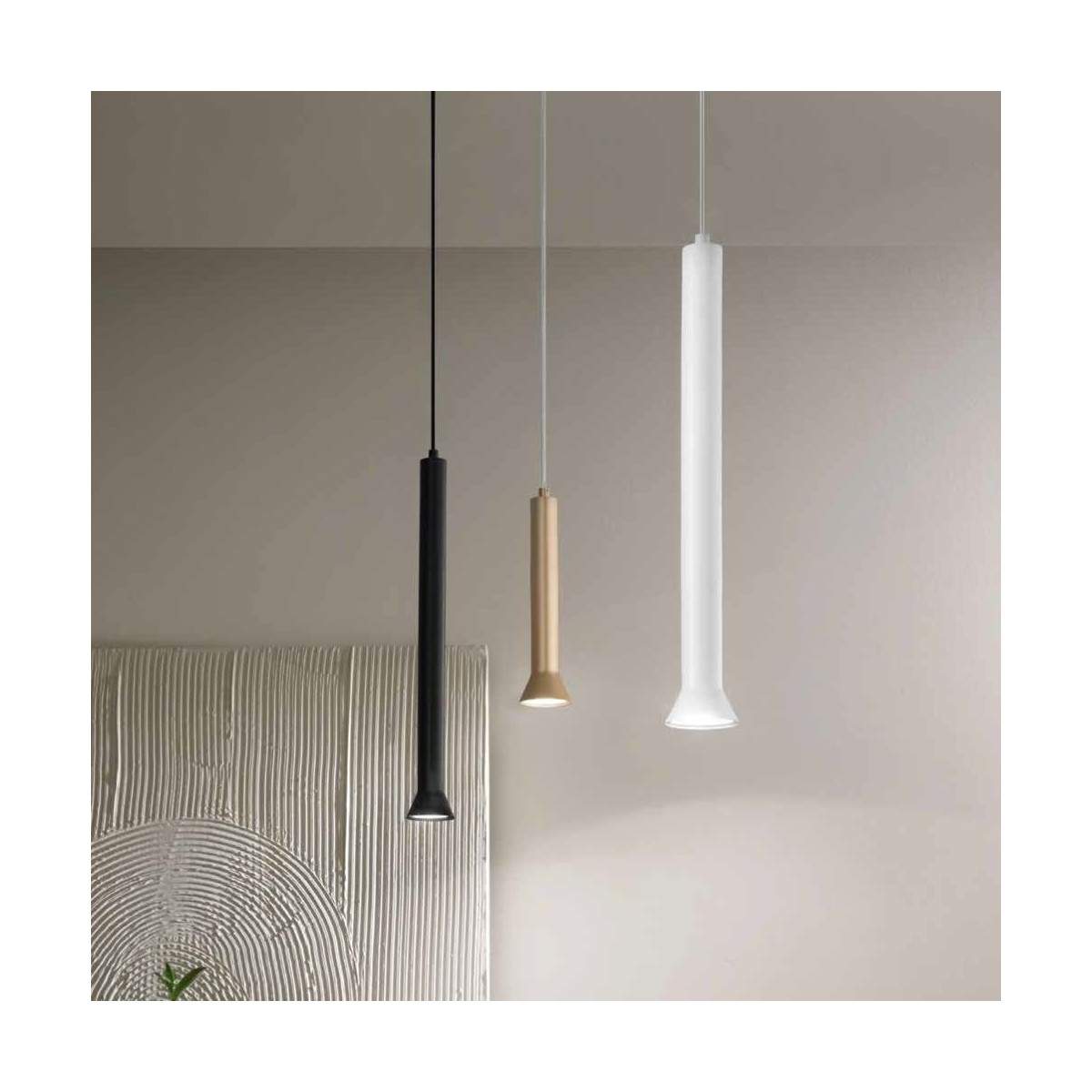 Disponibile in due formati — piccola (altezza 26 cm, diametro 6,6 cm) e grande (altezza 48 cm, diametro 6,6 cm) — LILA si caratterizza per una silhouette snella ed elegante, perfetta sia singolarmente che in cluster di più elementi, grazie anche al cavo regolabile che può raggiungere una lunghezza massima di 300 cm, ideale per soffitti alti o per creare scenografie luminose articolate.