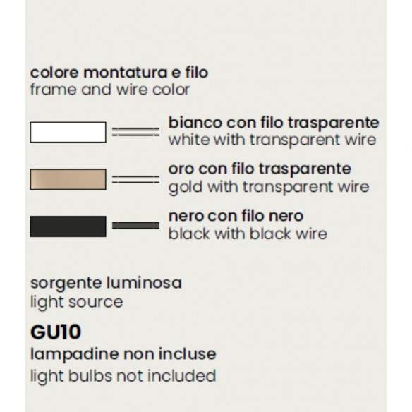 Puoi scegliere tra tre raffinati abbinamenti: bianco con filo trasparente, oro con filo trasparente o nero con filo nero, per adattarsi con naturalezza a interni moderni, classici o contemporanei.