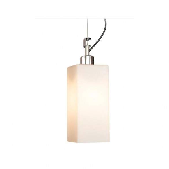 Disponibile in due varianti di colore: vetro opalino con dettagli cromati o nero con dettagli cromati, si adatta a diversi stili d’arredo. La lampada è regolabile in intensità se abbinata a una lampadina dimmerabile, per un’illuminazione personalizzata.