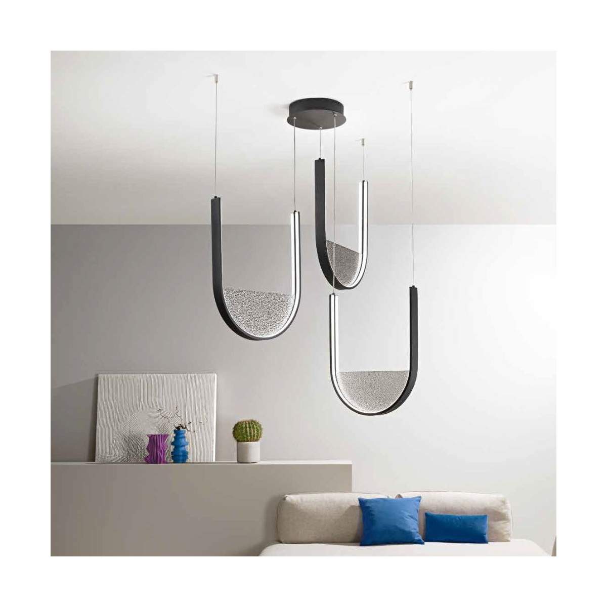 I cavi regolabili fino a 300 cm consentono di gestire la sospensione come preferisci, creando composizioni lineari o giochi di altezze che impreziosiscono lo spazio. La sorgente LED garantisce efficienza energetica e una luce piena, perfetta per far brillare la particolare texture del vetro granigliato.