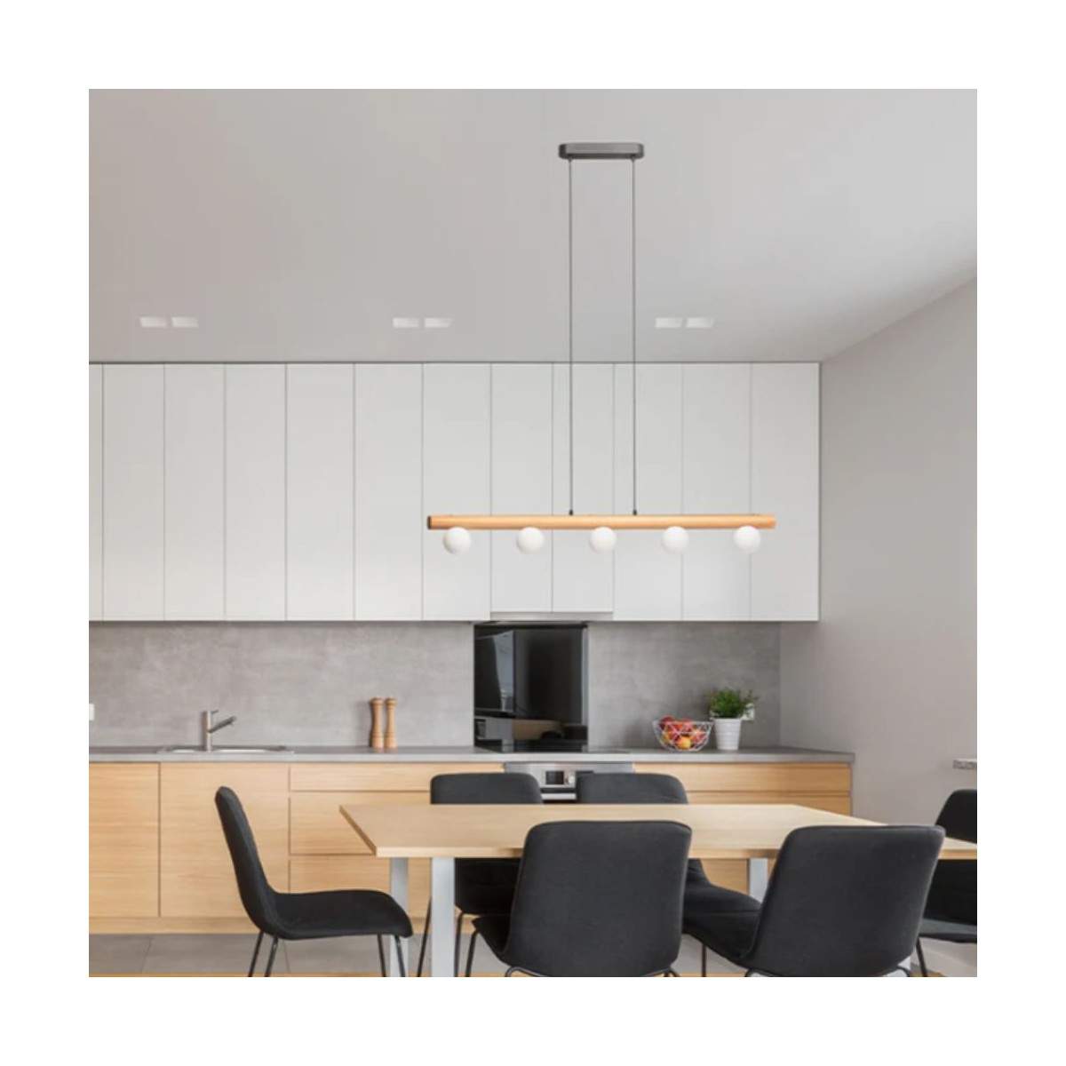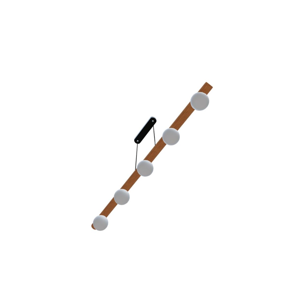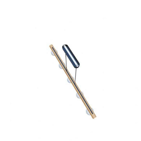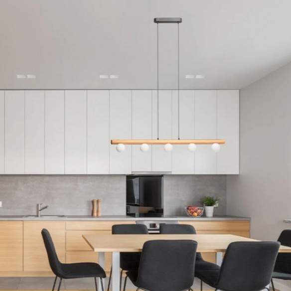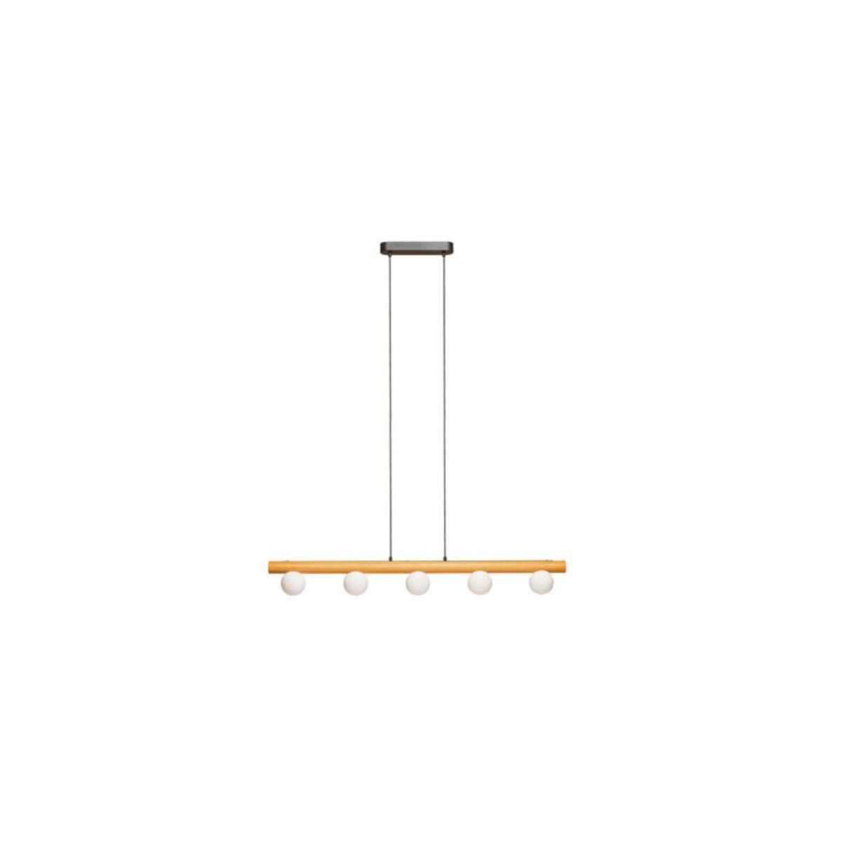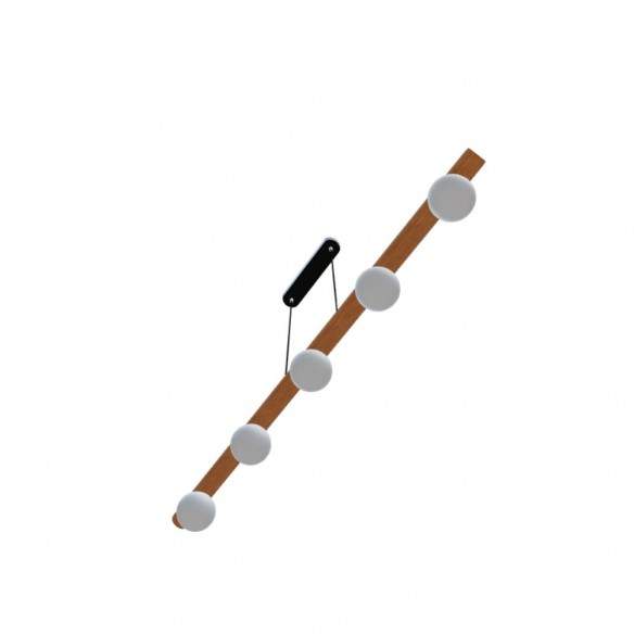 Lampada sospesa NOCTIS Apparecchio a sospensione con cinque paralumi in vetro opalino fissati su una base in legno.
