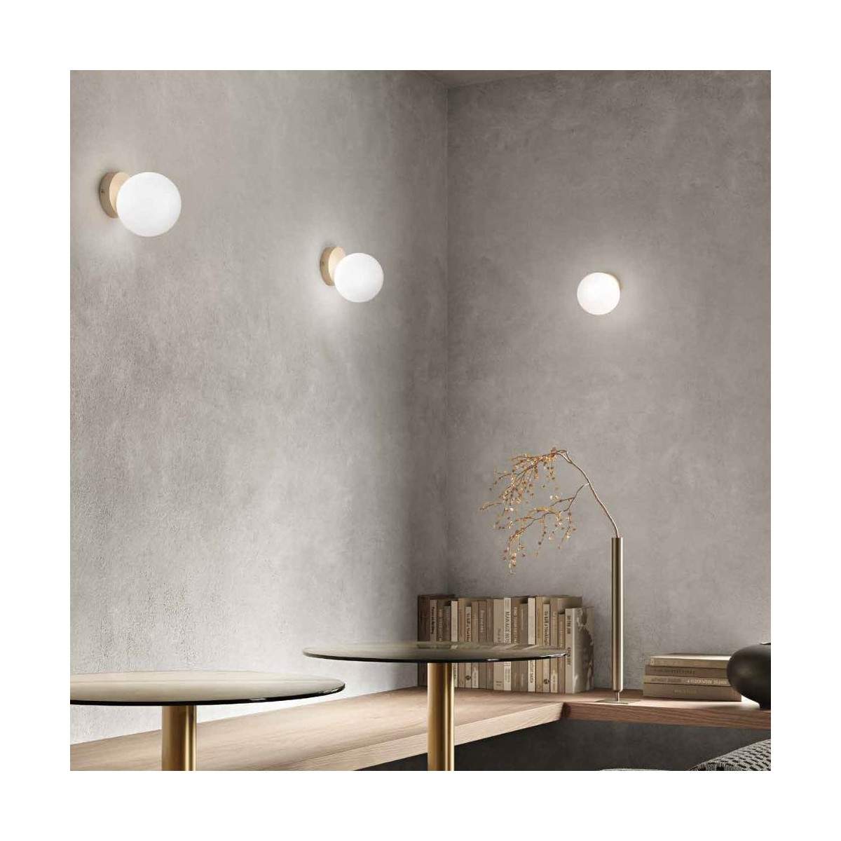 Disponibile in diverse combinazioni cromatiche — bianco con vetro bianco, oro con vetro bianco, nero con vetro bianco e nero con vetro fumè — PALLINA si adatta con naturalezza a contesti sia moderni che classici, portando un tocco di eleganza senza tempo.