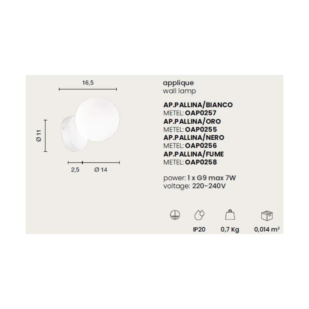Funziona con 1 lampadina G9 max 7W (non inclusa), ideale per creare un’illuminazione morbida ma decisa, perfetta per atmosfere accoglienti. Il tutto supportato da un voltaggio 220-240V, per garantire affidabilità e semplicità di installazione.
