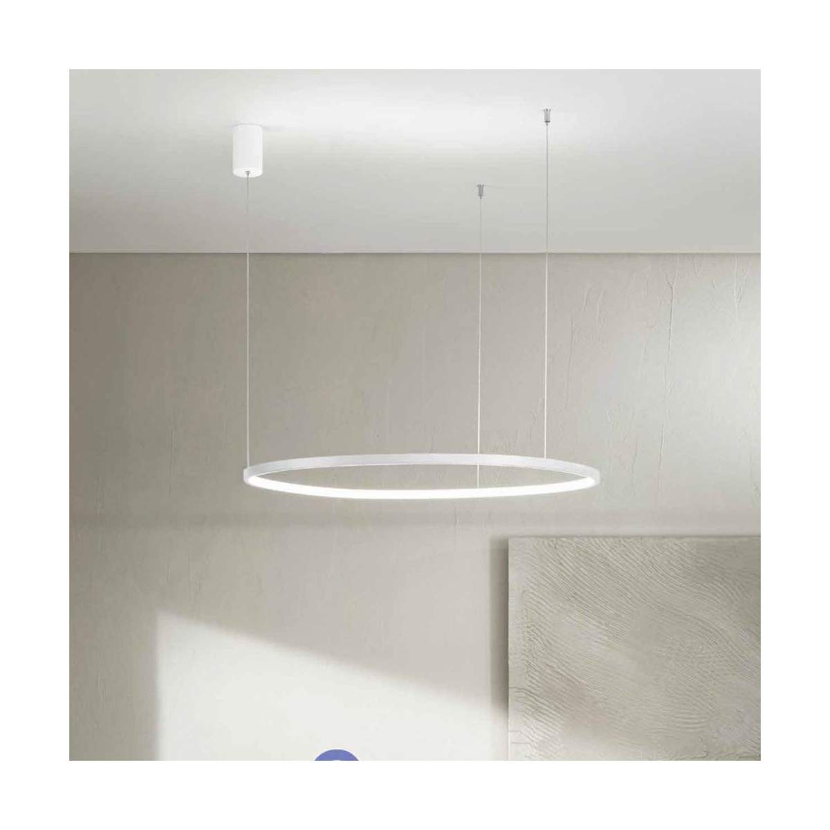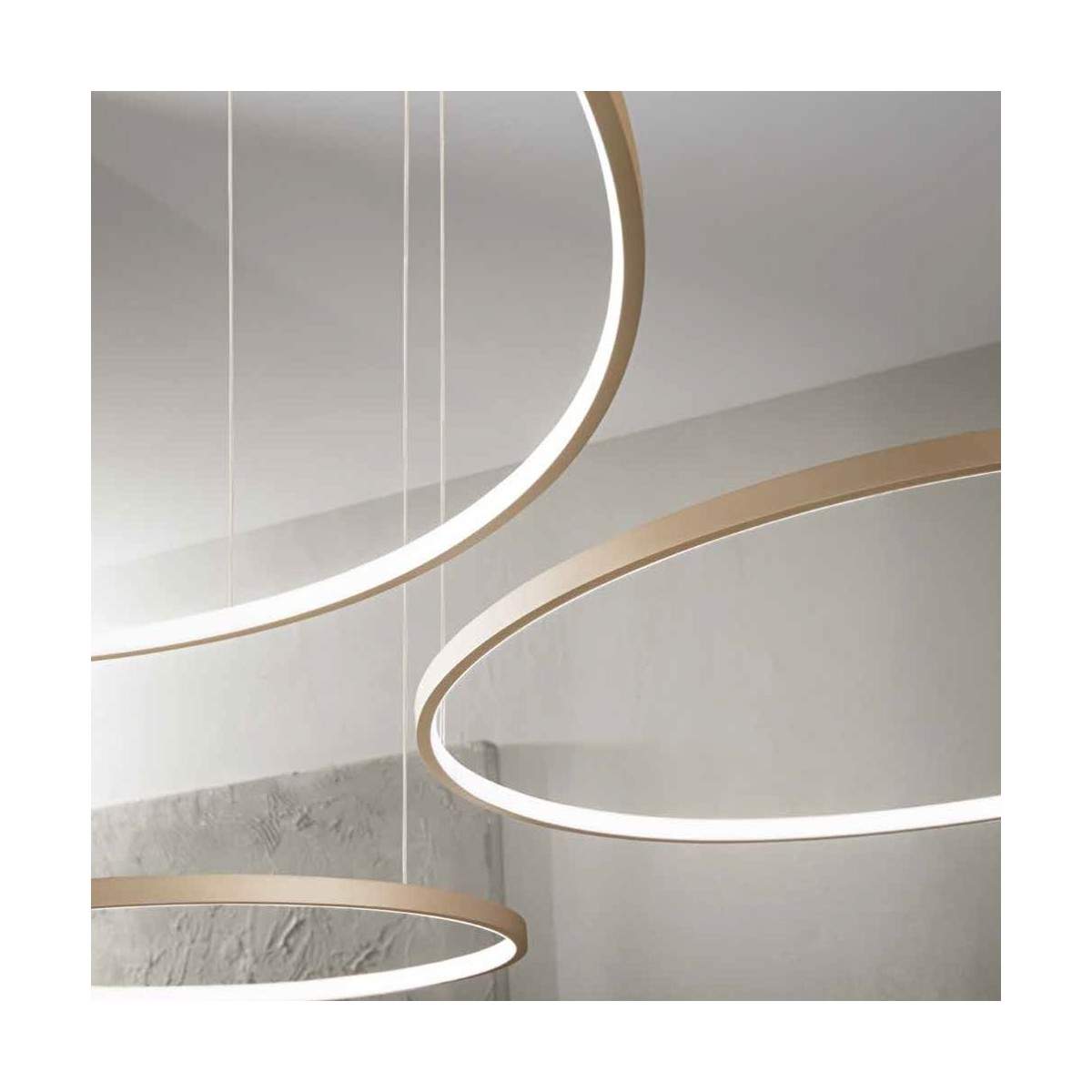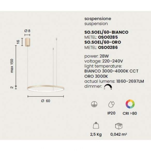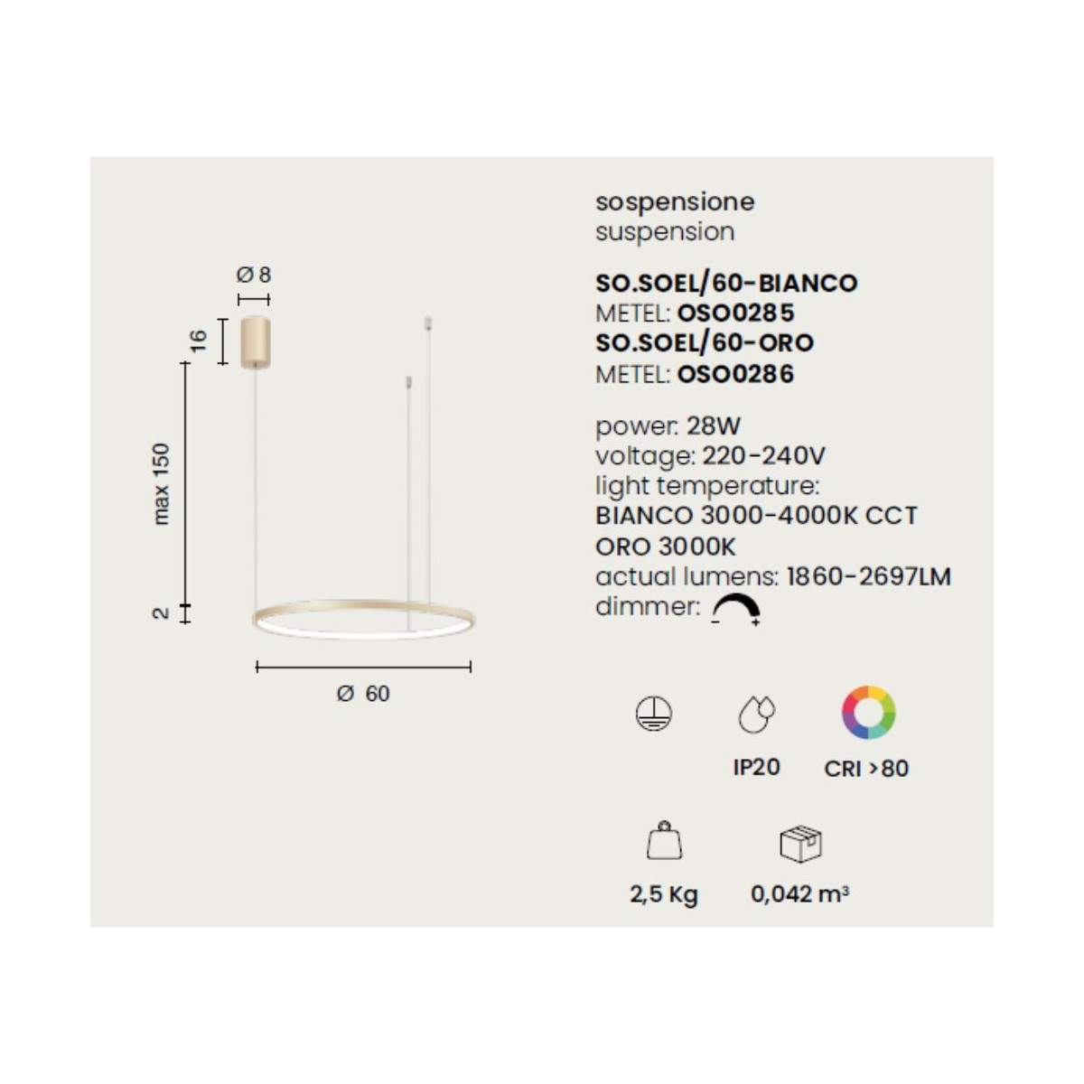 La lampada sospesa SOEL si distingue per il suo design essenziale e sofisticato, perfetto per ambienti moderni e ricercati. Realizzata in metallo verniciato, è disponibile nelle eleganti finiture bianco e oro, con la possibilità di scegliere tra la versione singola oppure a elementi multipli, per creare soluzioni luminose personalizzate e scenografiche.