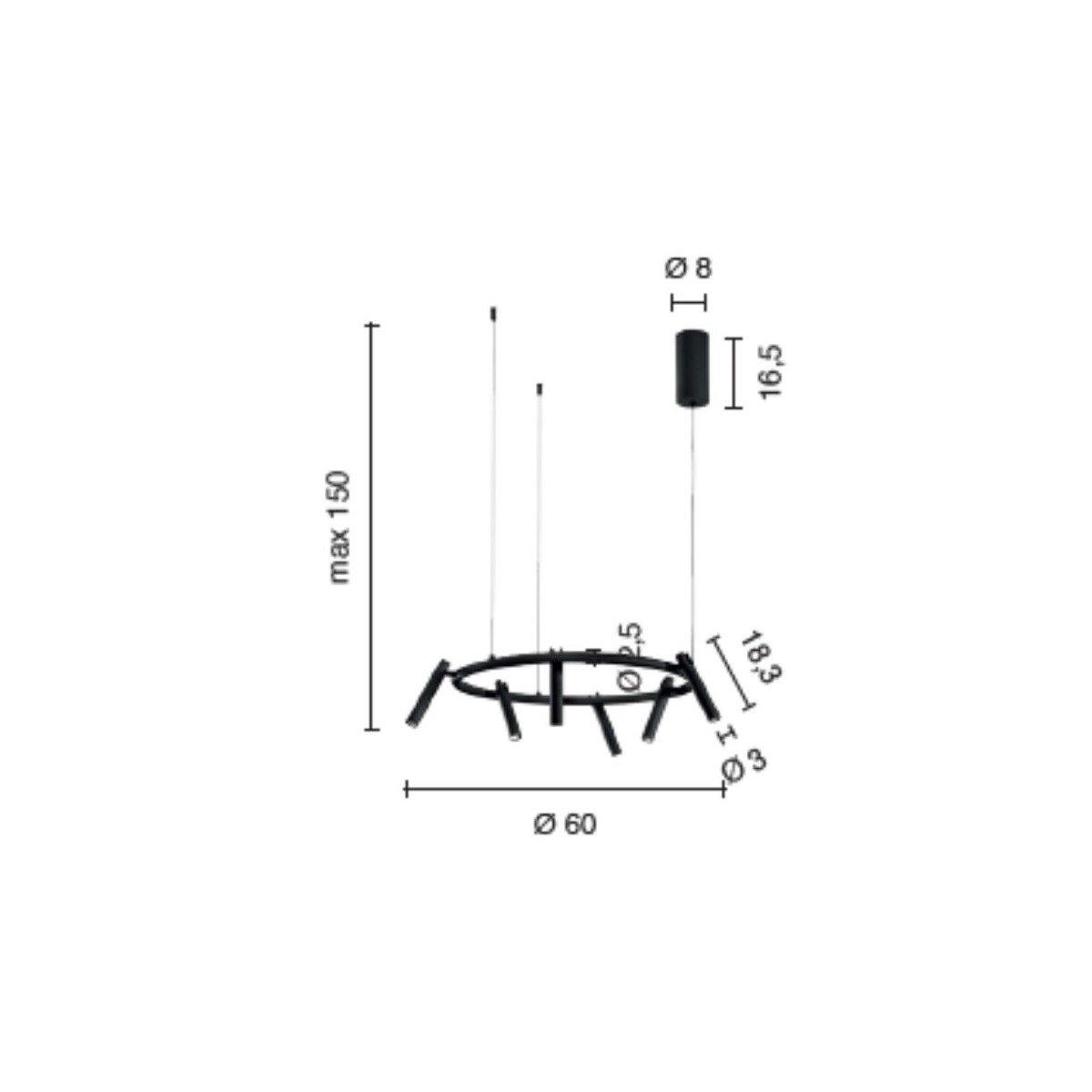 La versione con diametro 60 cm e altezza 150 cm è ideale per ambienti più raccolti o sopra un tavolo da pranzo. La versione da 120 cm di larghezza con altezza 150 cm è perfetta per ambienti ampi che richiedono una presenza scenica più importante.