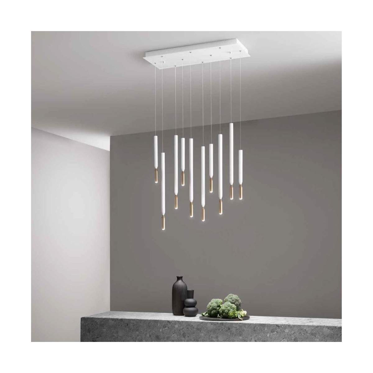 La composizione a 10 luci, sempre con LED da 7W, sviluppa 390 lumen per punto luce, con un’altezza di 34 cm.