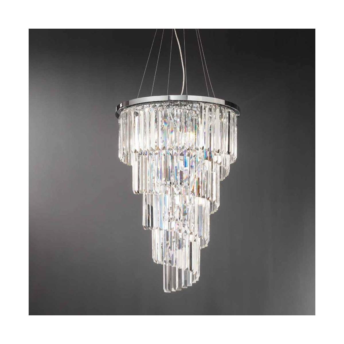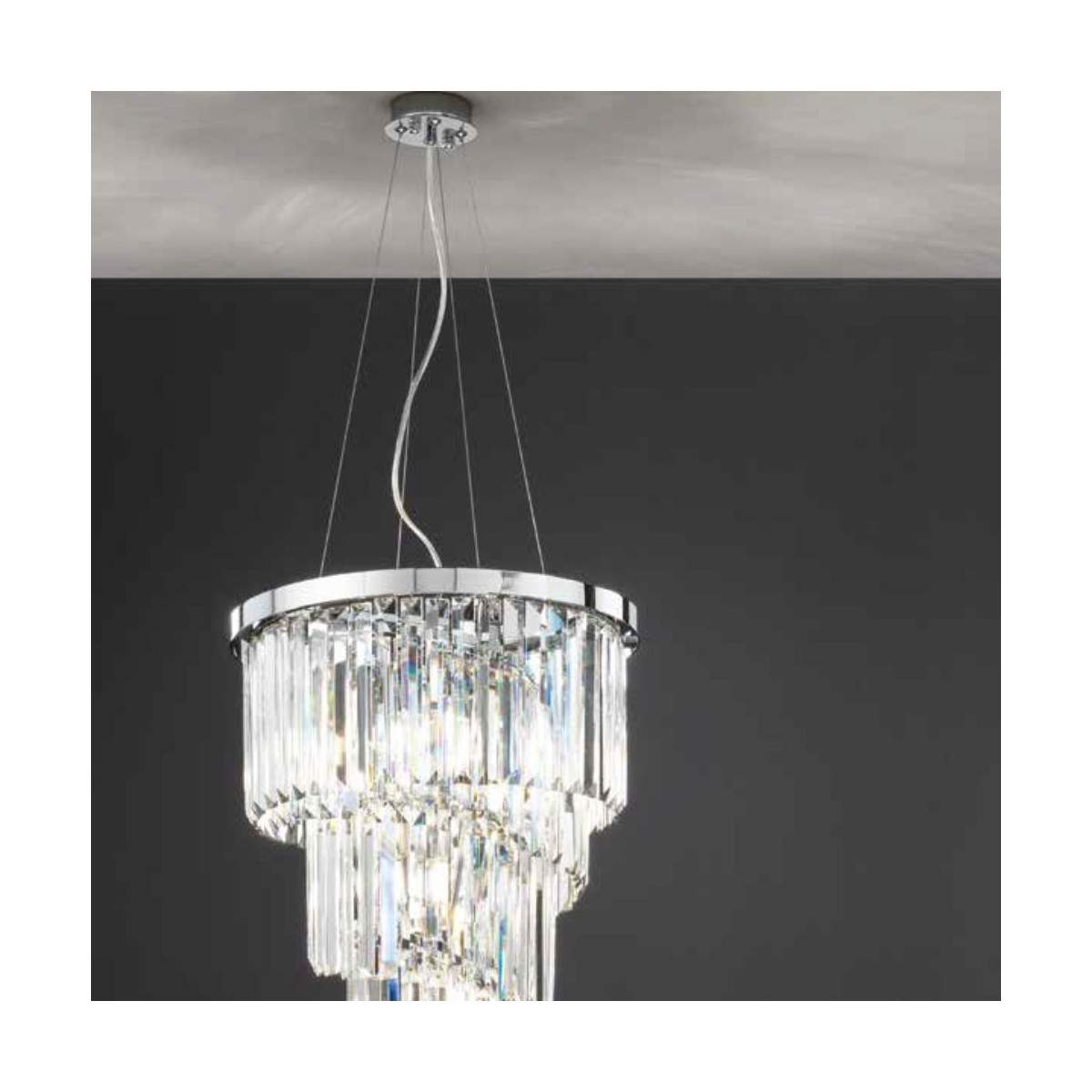 Lampadario ALEXANDER con struttura metallo cromato e elementi decorativi in cristallo molato. sospensioni con cavi in acciaio a lunghezza regolabile.