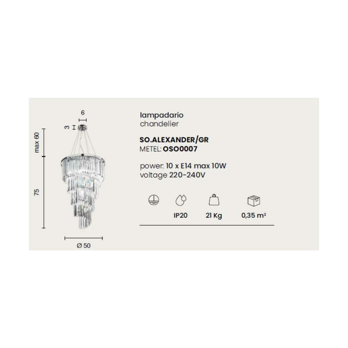 Compatibile con 10 lampadine attacco E14 (non incluse), Alexander offre la libertà di scegliere l’intensità e la tonalità luminosa più adatta al tuo stile. Ideale per chi cerca un'illuminazione decorativa ma funzionale, con una potenza massima di 10 x 10W e alimentazione a 220–240V
