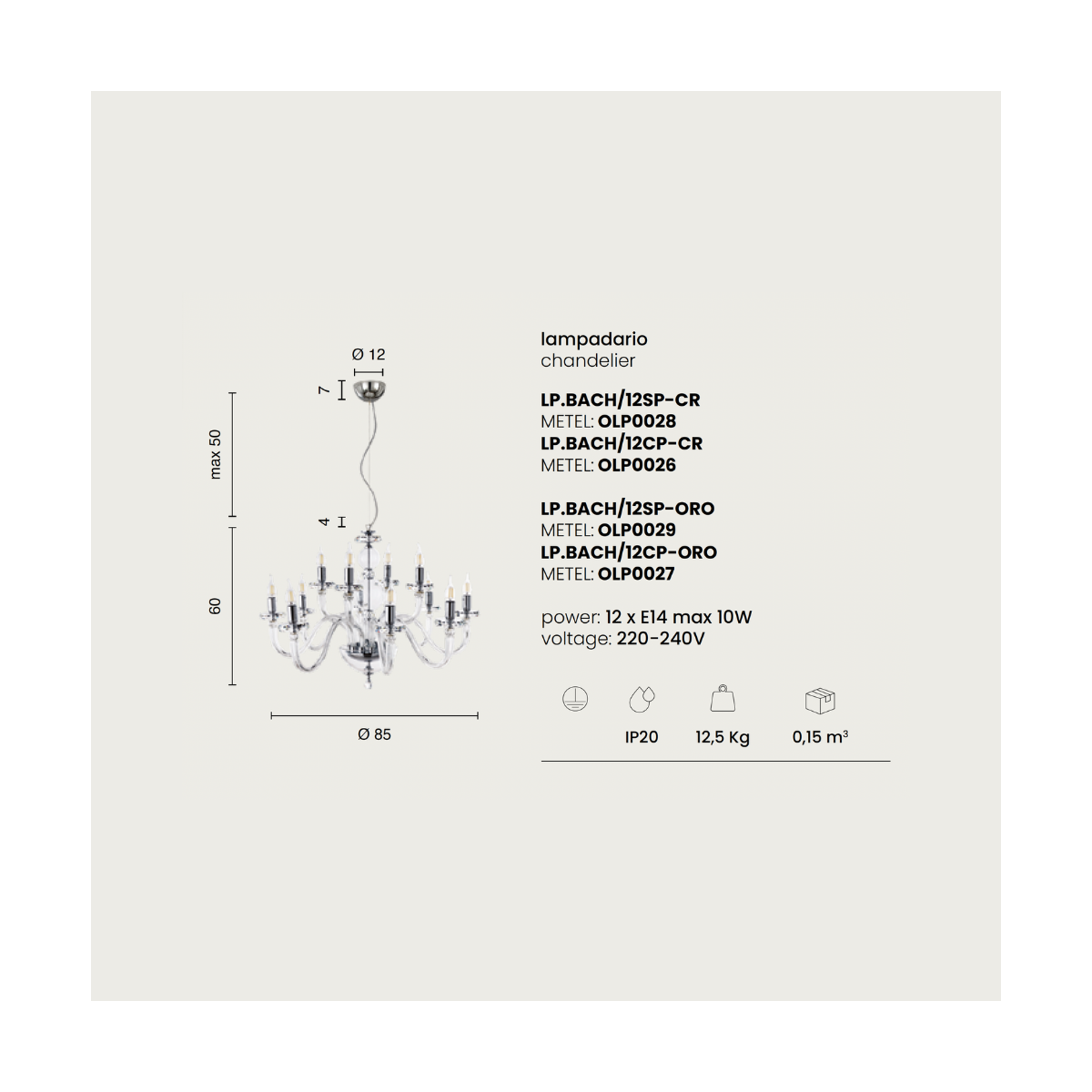 Pensato per soggiorni scenografici, sale da pranzo eleganti o ambienti dallo stile senza tempo, il lampadario BACH è disponibile in diverse configurazioni – 3, 6, 8 o 12 luci – per adattarsi con equilibrio a spazi piccoli o grandi.