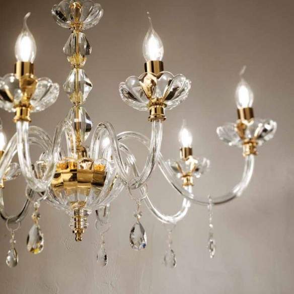 Lampadario BRIGIDA in cristallo e vetro trasparente, finitura oro, paralumi in tessuto avorio.