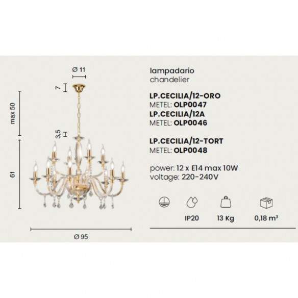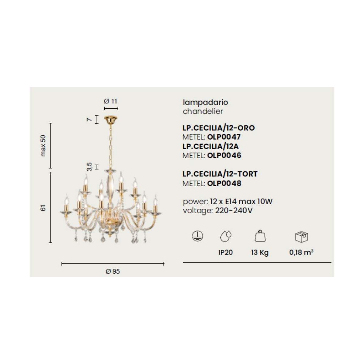 CECILIA è proposto in diverse dimensioni, con 3, 6, 8 o 12 luci, per adattarsi a qualsiasi spazio: dal tavolo da pranzo alla sala ricevimento, fino a un elegante ingresso.