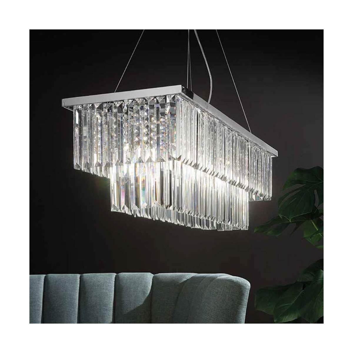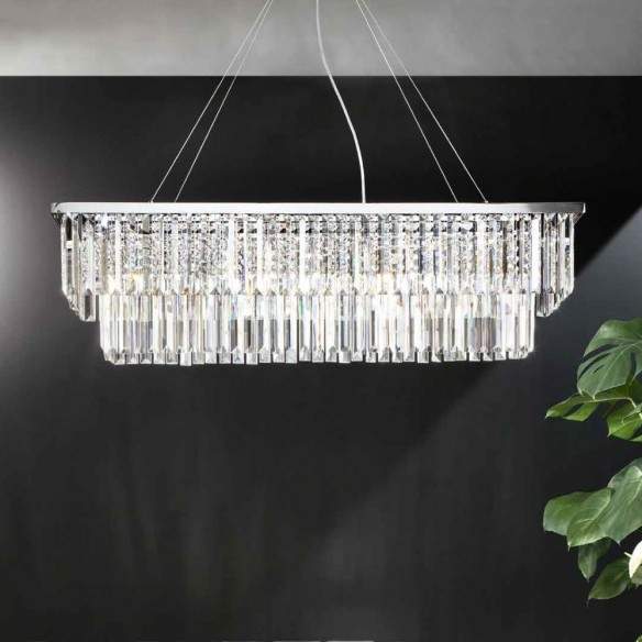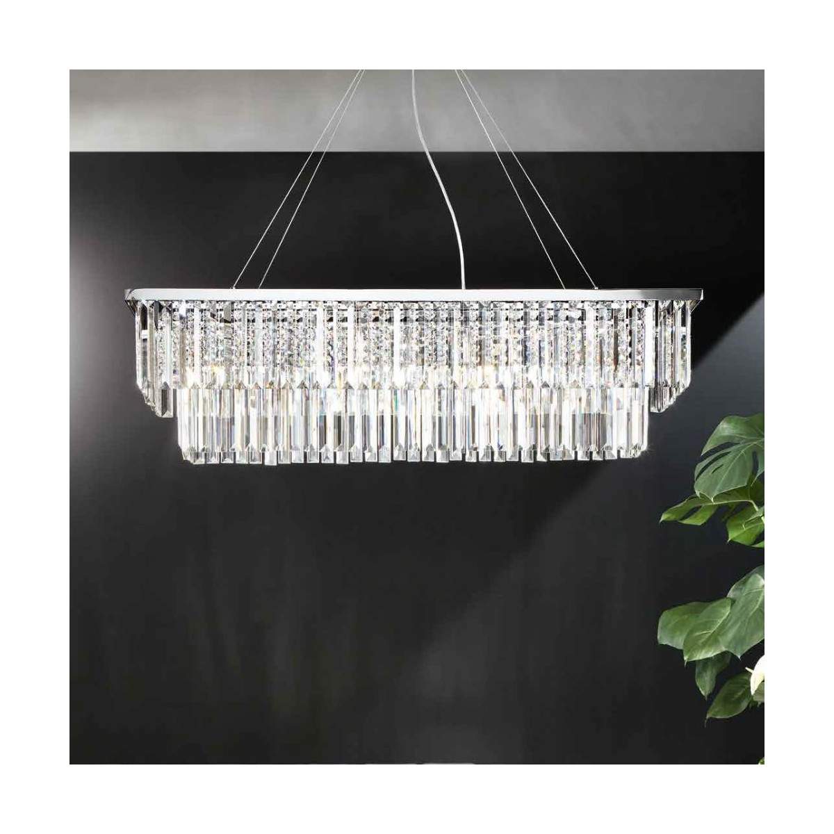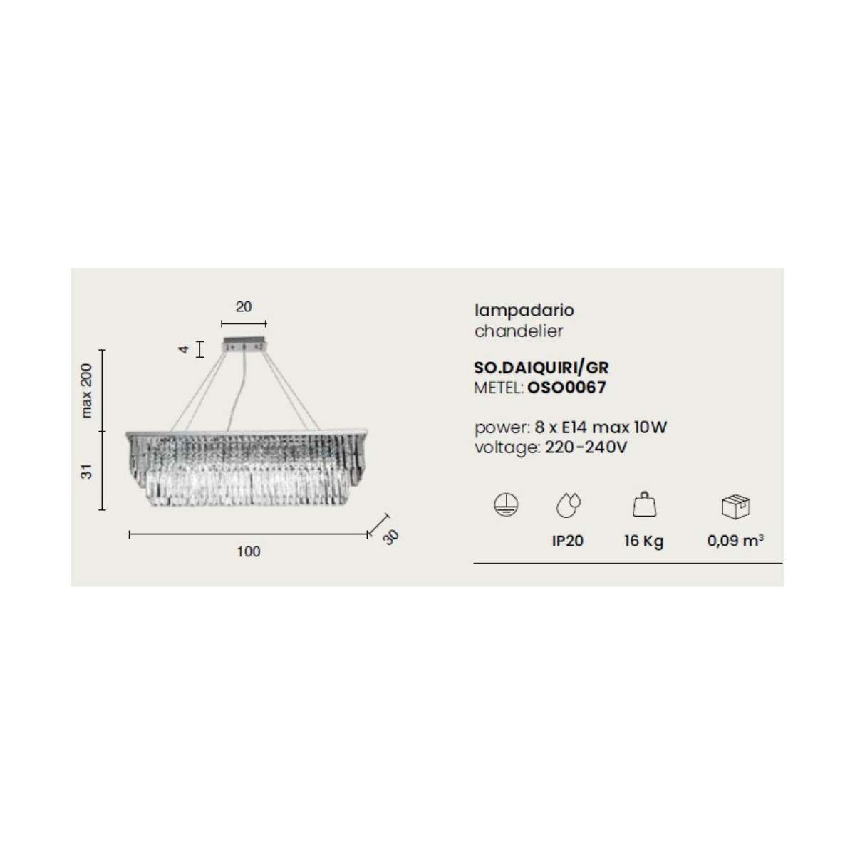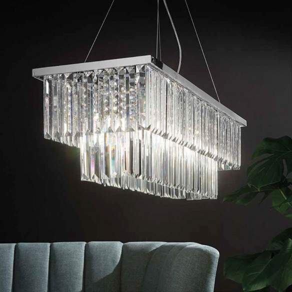 Lampadario DAIQUIRI con struttura in metallo cromato e elementi decorativi in cristallo molato. Sospensioni con cavi in acciaio a lunghezza regolabile.