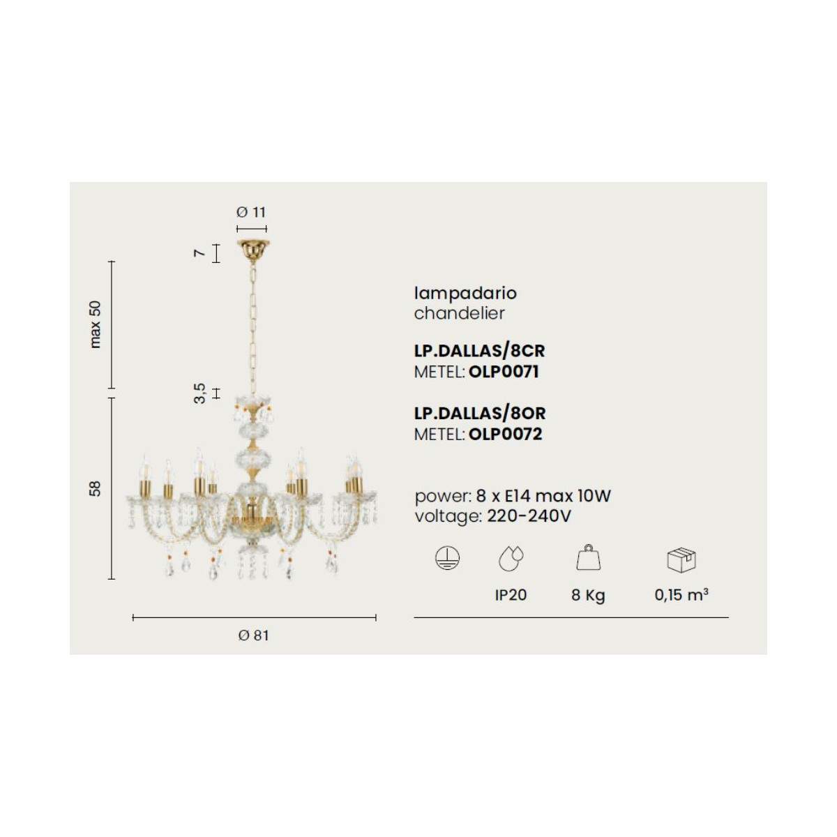 DALLAS è la scelta perfetta per chi cerca un lampadario senza tempo, capace di illuminare e impreziosire soggiorni, sale da pranzo, ingressi o camere con un’allure sofisticata e intramontabile.