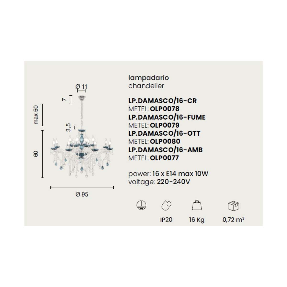 DAMASCO utilizza lampadine E14 (max 10W, non incluse) e funziona con alimentazione 220–240V. Un vero gioiello luminoso, pensato per chi cerca una luce che non sia solo illuminazione, ma un autentico elemento d’arredo, capace di infondere personalità e carattere a tutto lo spazio.