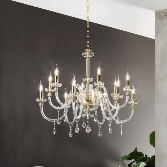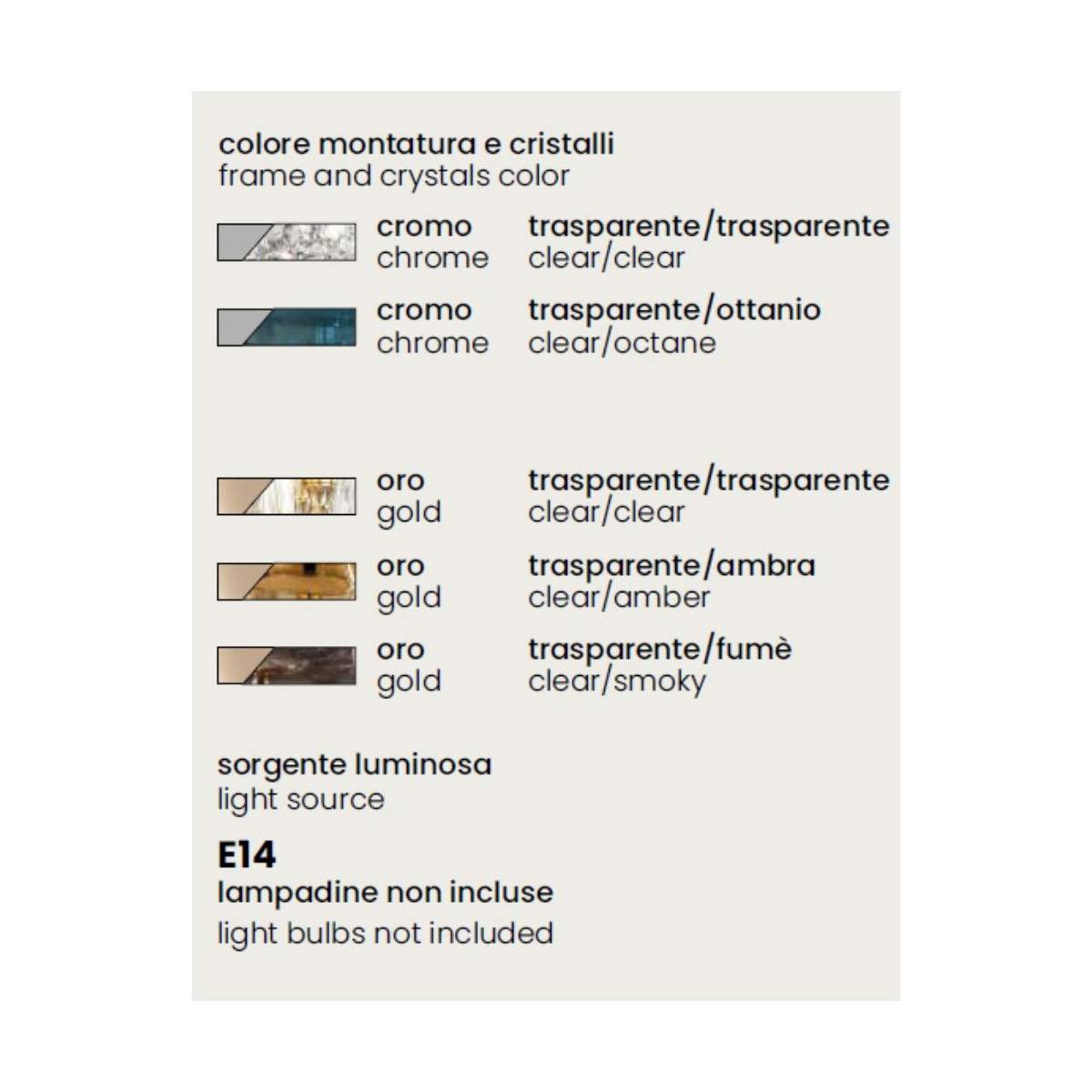 Le finiture in metallo si fondono armoniosamente con le delicate trasparenze del vetro, esaltandone le tonalità e donando al lampadario un carattere unico. Puoi scegliere tra raffinate combinazioni cromatiche che si adattano a ogni stile e atmosfera: