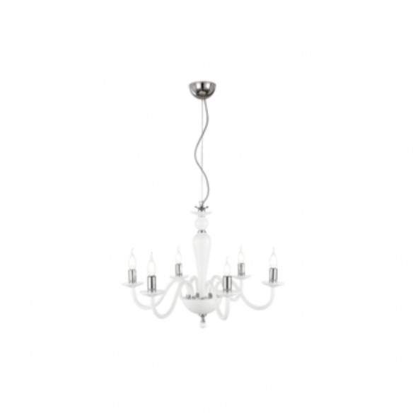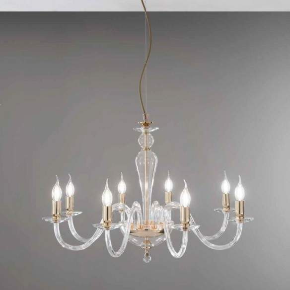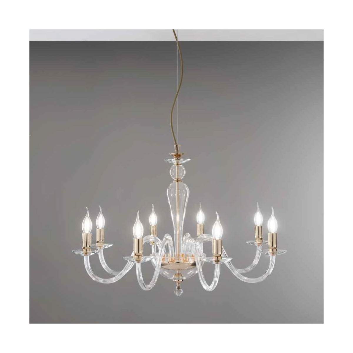 Lampadario PAGANINI in vetro lavorato a mano. Dettagli in cristallo ottico. Finiture in metallo. Cavetti in acciaio regolabili in altezza.