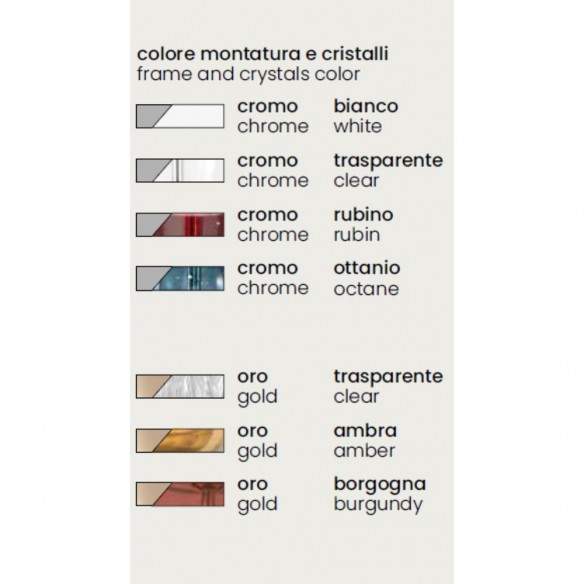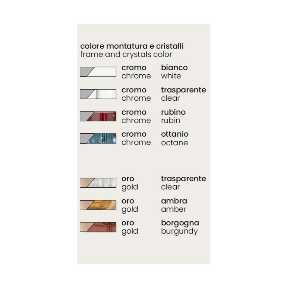 Proposto in ben sette combinazioni cromatiche — Cromo Bianco, Cromo Trasparente, Cromo Rubino, Cromo Ottanio, Oro Trasparente, Oro Ambra e Oro Borgogna — riesce a dialogare con stili d’arredo diversi, dal più sobrio ed elegante al più teatrale e scenografico.