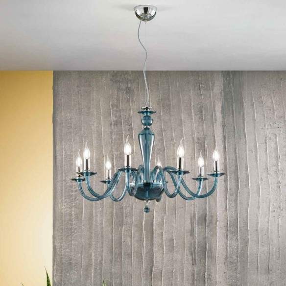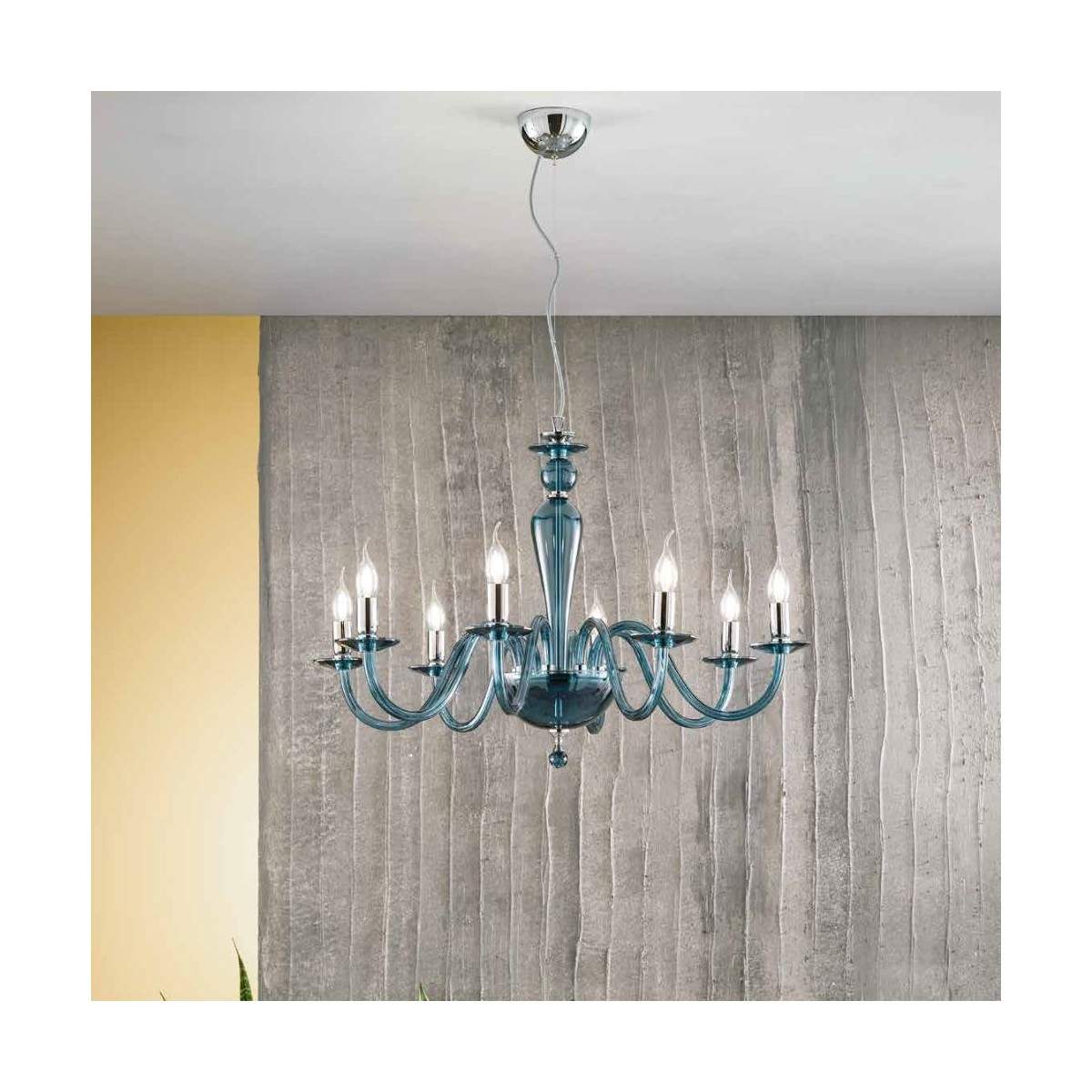 Lampadario PAGANINI in vetro lavorato a mano. Dettagli in cristallo ottico. Finiture in metallo. Cavetti in acciaio regolabili in altezza.