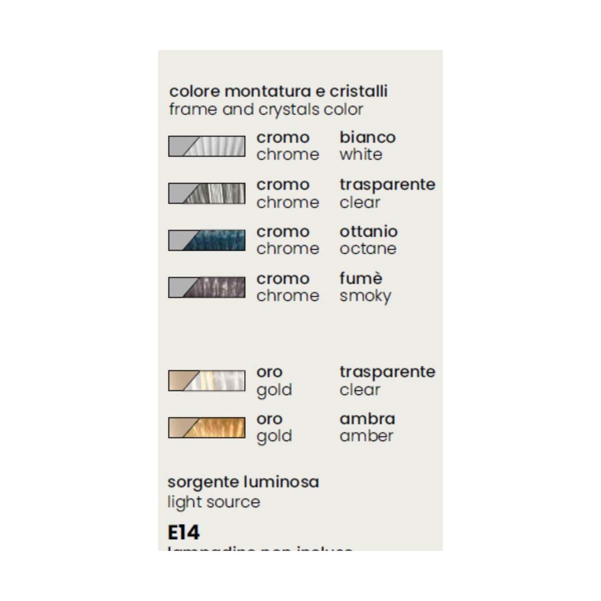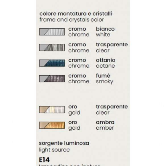 Le finiture in metallo — cromo o oro — si combinano con una ricca gamma di colori vetro come trasparente, bianco, ottanio, fumè e ambra, per adattarsi con gusto a ogni stile d’arredo.