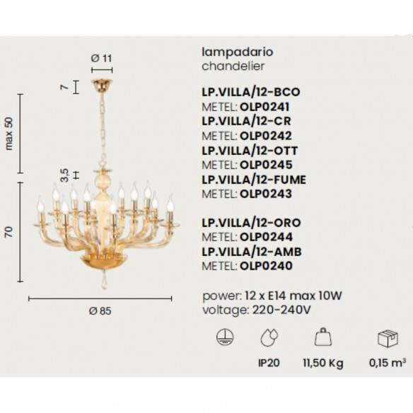 Disponibile nelle versioni a 8 o 12 luci, il lampadario VILLA utilizza lampadine con attacco E14 (non incluse), assicurando una luce diffusa e calda, capace di esaltare volumi e dettagli dell’ambiente.
