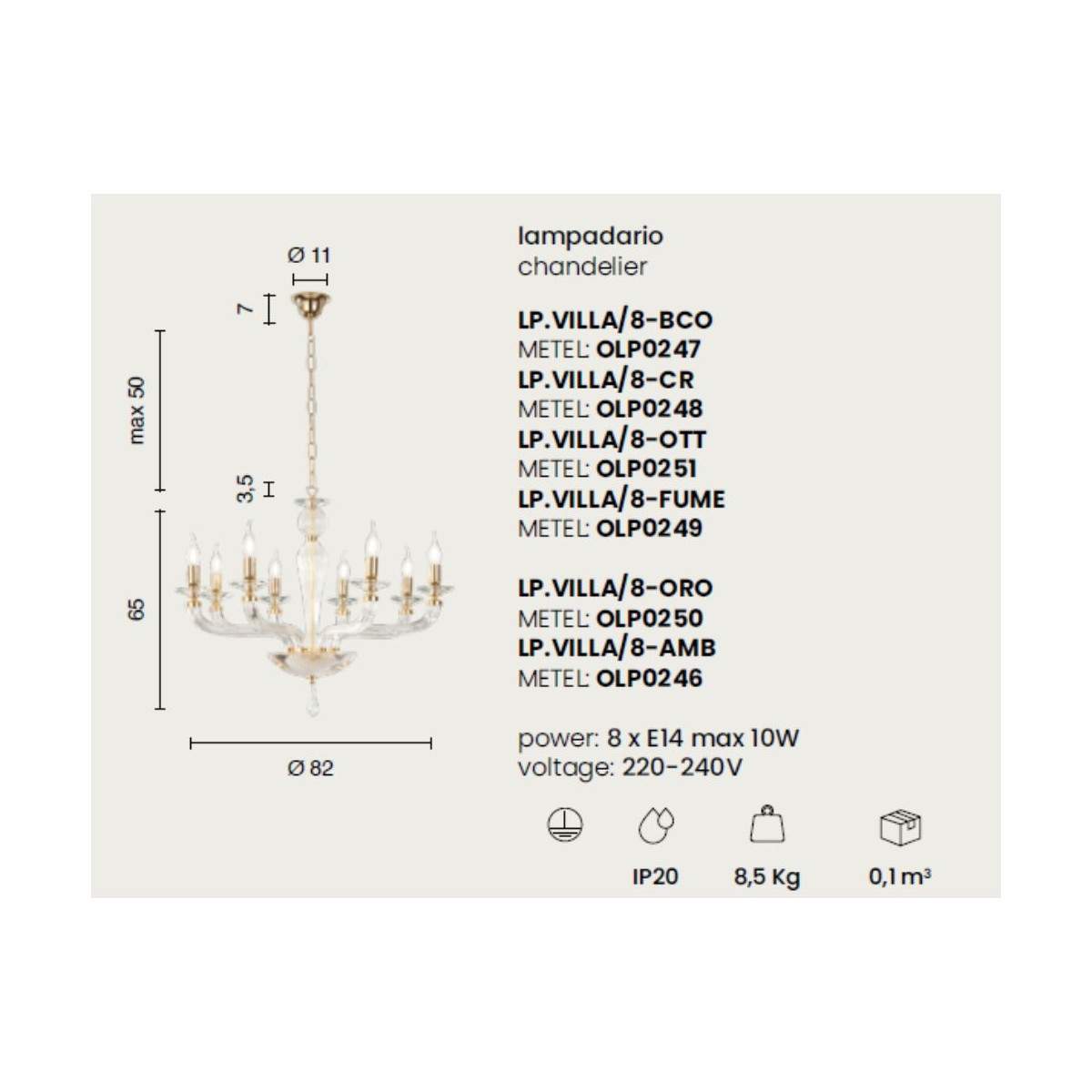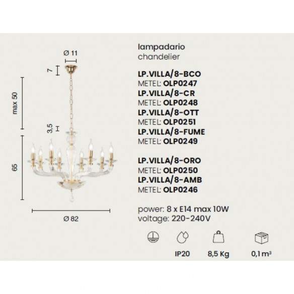 Disponibile nelle versioni a 8 o 12 luci, il lampadario VILLA utilizza lampadine con attacco E14 (non incluse), assicurando una luce diffusa e calda, capace di esaltare volumi e dettagli dell’ambiente.