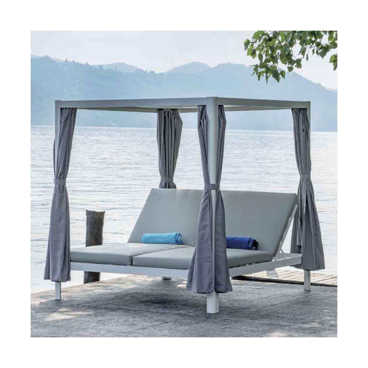 A rendere questo lettino ancora più esclusivo sono le tende in poliestere grigio chiaro, che avvolgono la struttura creando un’atmosfera intima e riparata dal sole, ideale per momenti di puro relax.