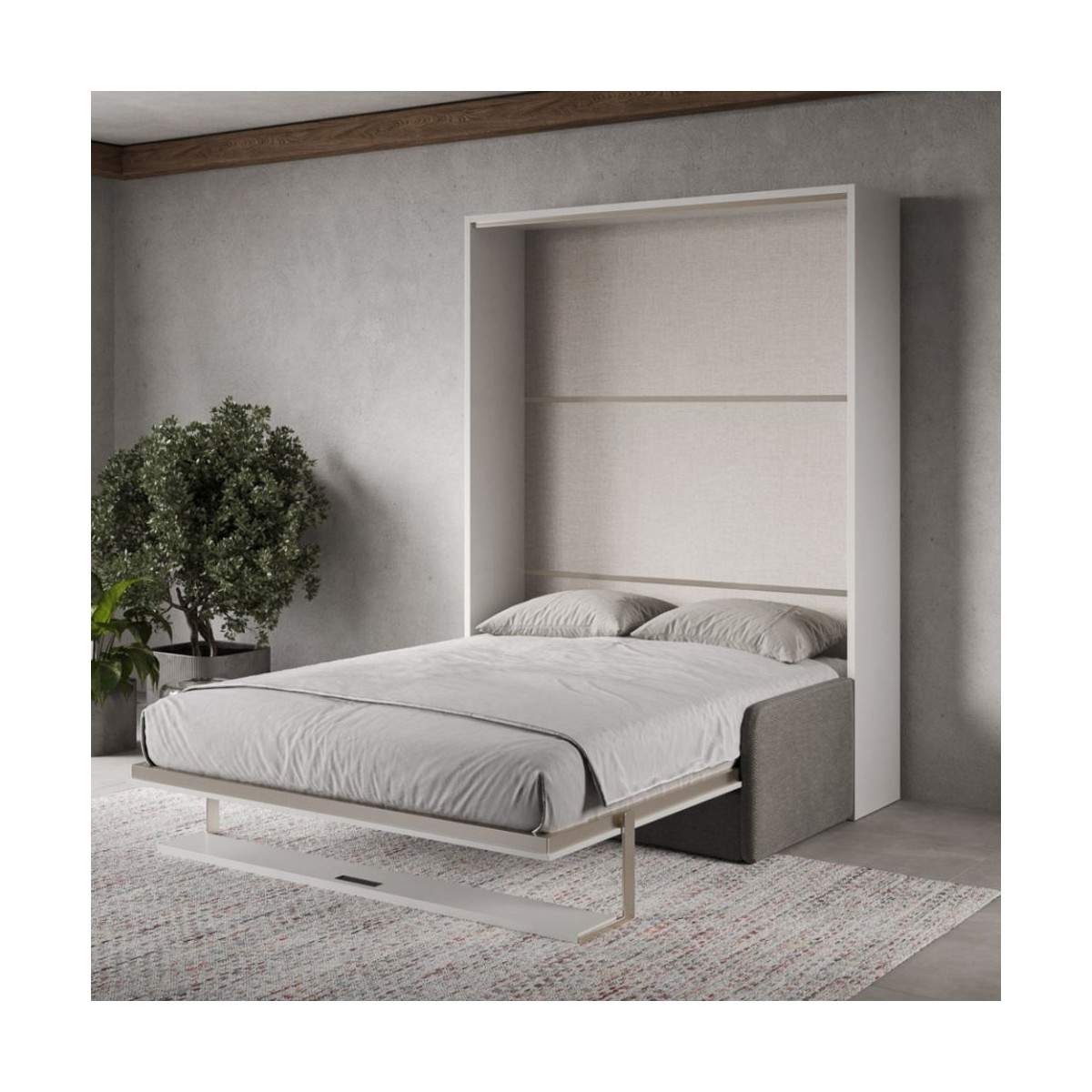 Versia Sofà è molto più di un letto a scomparsa: è un vero progetto di design che trasforma il tuo spazio con eleganza e intelligenza. Di giorno, un comodo divano con mensola integrata regala stile e comfort alla zona living; di notte, in pochi gesti, il sistema a ribalta verticale svela un letto matrimoniale francese da 140 cm, pronto ad accoglierti per un riposo profondo e rigenerante.