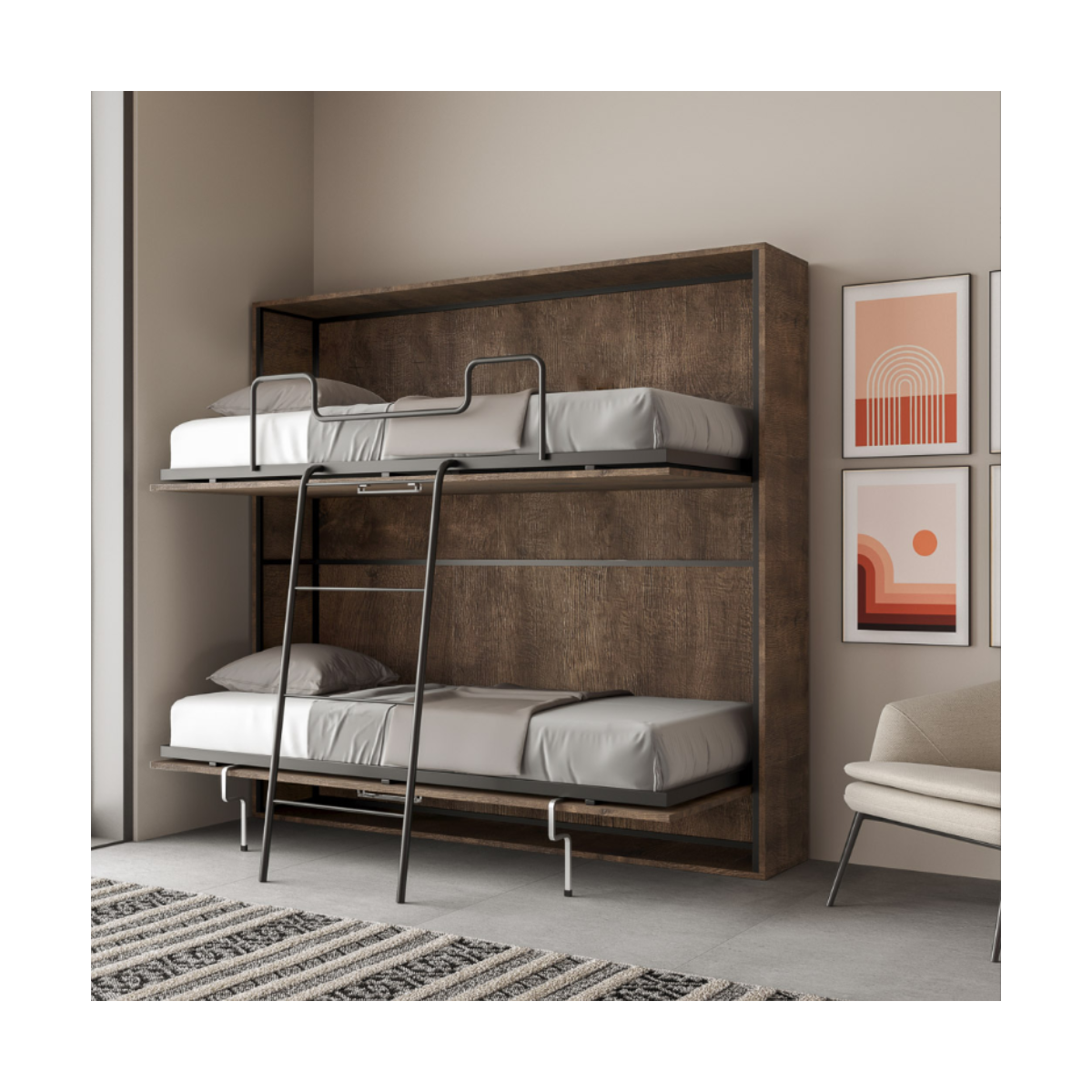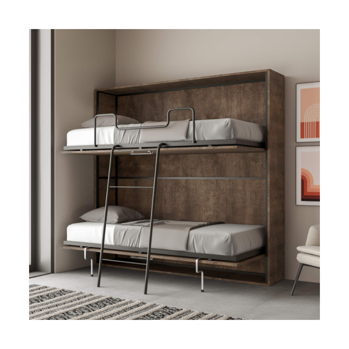 Da chiuso, il letto Kando si integra perfettamente alla parete con una profondità di appena 39,2 cm, mantenendo l’ambiente libero e ordinato. Una volta aperto, raggiunge 106 cm di profondità, offrendo due letti singoli sovrapposti dalle dimensioni generose (85×190 cm), perfetti per un riposo confortevole.