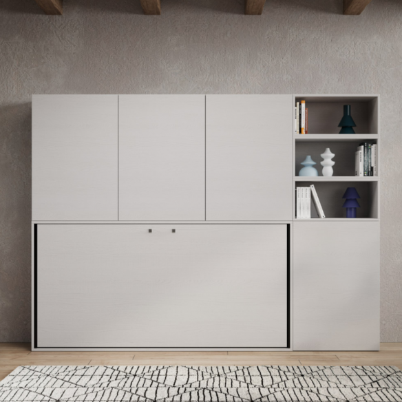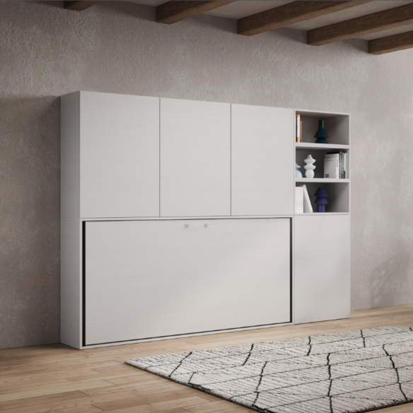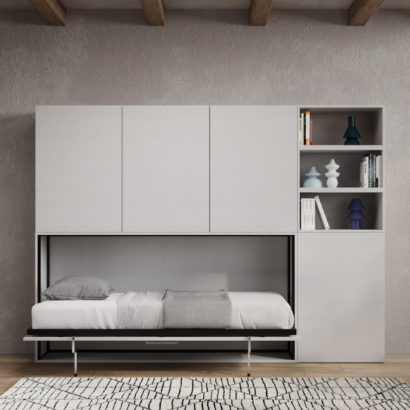 Kando F è una soluzione d’arredo intelligente, capace di unire la funzionalità di un letto singolo a scomparsa con la praticità di una libreria/armadio spaziosa ed elegante. Con sette vani ben distribuiti – quattro chiusi da ante con ripiano interno e tre aperti – offre tutto lo spazio necessario per organizzare libri, accessori e oggetti decorativi, mantenendo l’ambiente ordinato e armonioso. Quando chiuso, il mobile ha una profondità di soli 39,2 cm, riducendo al minimo l’ingombro e permettendo di sfruttare al meglio ogni centimetro della stanza. Un complemento versatile, perfetto per chi vive in monolocali, open space o ambienti multifunzionali e desidera unire estetica e praticità.