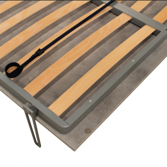 Il letto è costruito con una robusta struttura in pannelli di particelle di legno nobilitato da 18 mm, garantendo stabilità e durata nel tempo. La rete, realizzata in ferro rinforzato verniciato con polvere epossidica nel raffinato colore alluminio goffrato, assicura solidità e resistenza. In dotazione è inclusa una rete a doghe di faggio da 163×190 cm, progettata per supportare il materasso in modo ottimale e migliorare la qualità del riposo. Per una maggiore praticità, sono incluse cinghie ferma-materasso, che permettono di mantenere il letto in perfetto ordine anche quando viene richiuso.