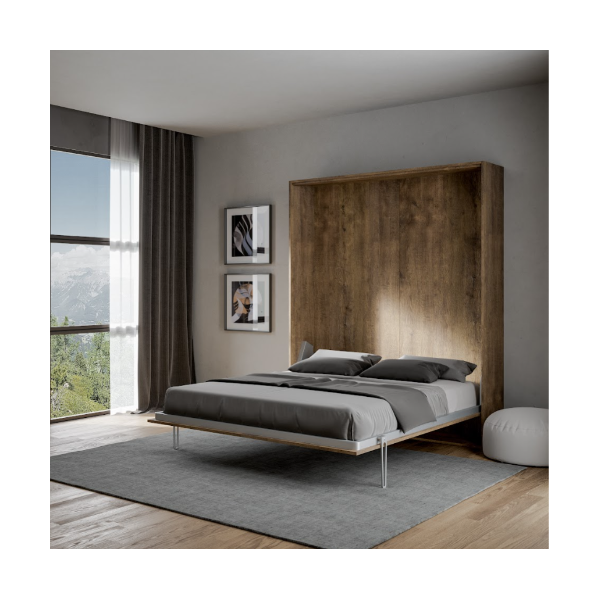 Il letto è costruito con una robusta struttura in pannelli di particelle di legno nobilitato da 18 mm, garantendo stabilità e durata nel tempo. La rete, realizzata in ferro rinforzato verniciato con polvere epossidica nel raffinato colore alluminio goffrato, assicura solidità e resistenza. In dotazione è inclusa una rete a doghe di faggio da 163×190 cm, progettata per supportare il materasso in modo ottimale e migliorare la qualità del riposo. Per una maggiore praticità, sono incluse cinghie ferma-materasso, che permettono di mantenere il letto in perfetto ordine anche quando viene richiuso.
