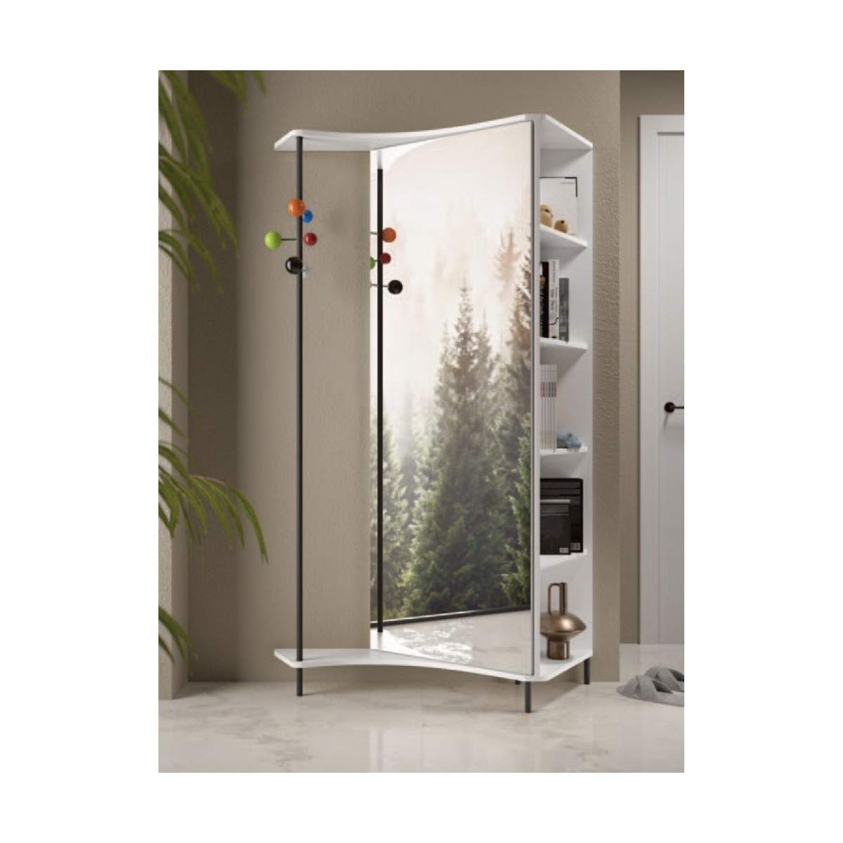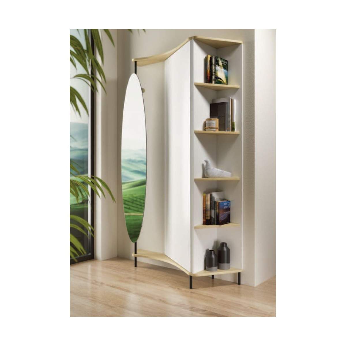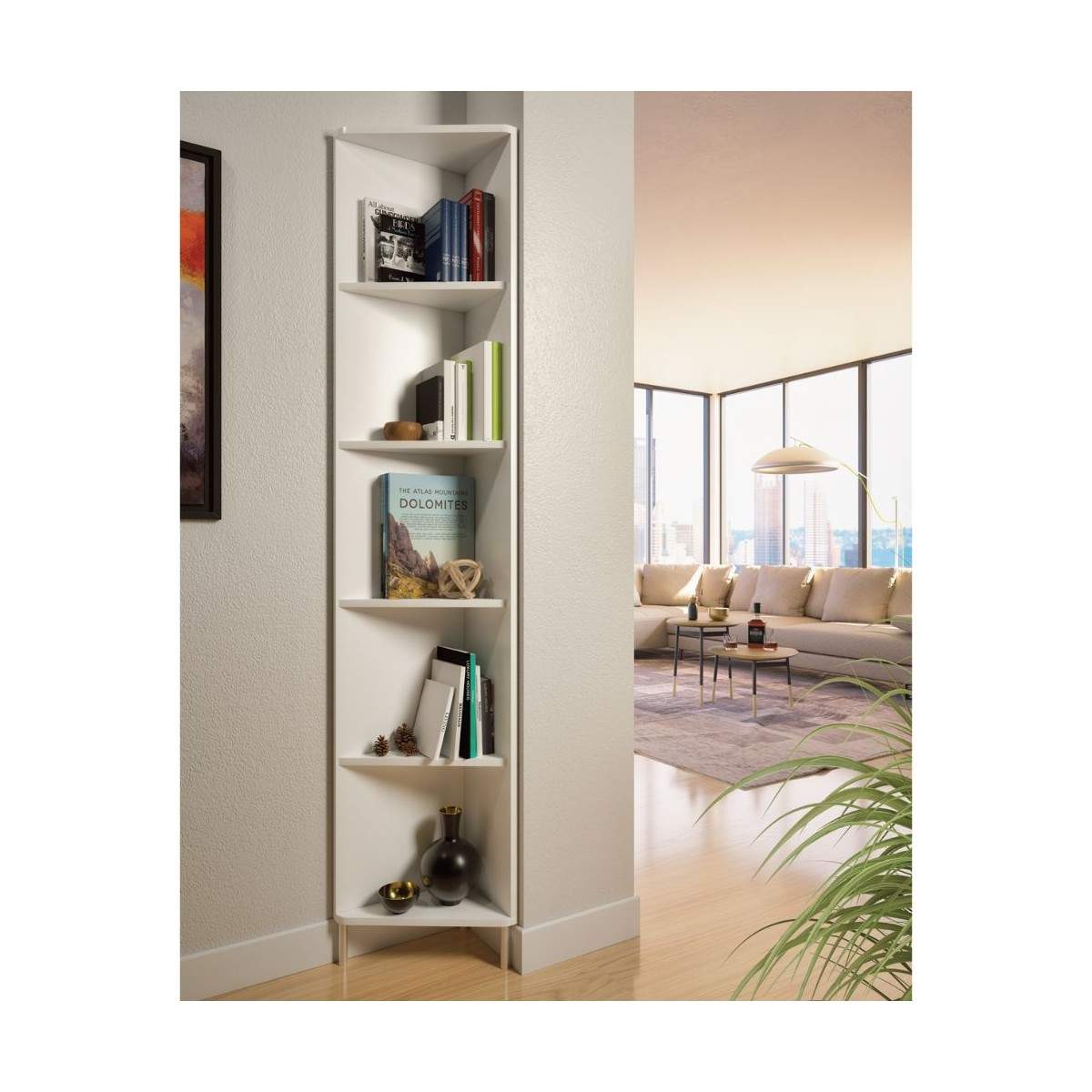 Realizzata in legno rivestito melaminico, nasce per sfruttare l’angolo in verticale, trasformandolo in una zona funzionale ed elegante, perfetta per ingressi, soggiorni, studi o zone di passaggio.